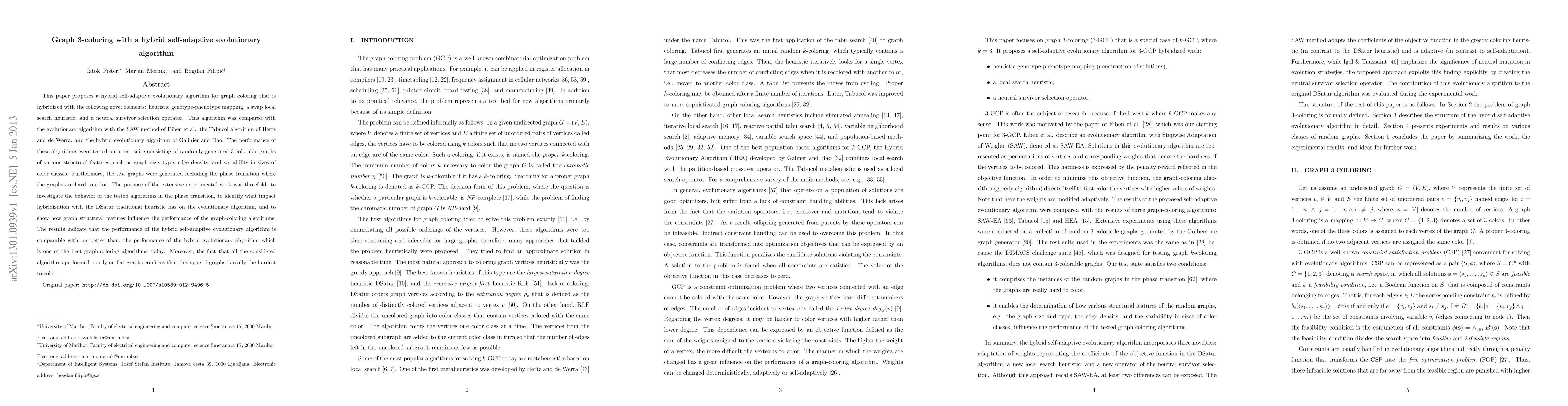 This paper proposes a hybrid self-adaptive evolutionary algorithm for graph coloring that is hybridized with the following novel elements: heuristic genotype-phenotype mapping, a swap local search heuristic, and a neutral survivor selection operator. This algorithm was compared with the evolutionary algorithm with the SAW method of Eiben et al., the Tabucol algorithm of Hertz and de Werra, and the hybrid evolutionary algorithm of Galinier and Hao. The performance of these algorithms were tested on a test suite consisting of randomly generated 3-colorable graphs of various structural features, such as graph size, type, edge density, and variability in sizes of color classes. Furthermore, the test graphs were generated including the phase transition where the graphs are hard to color. The purpose of the extensive experimental work was threefold: to investigate the behavior of the tested algorithms in the phase transition, to identify what impact hybridization with the DSatur traditional heuristic has on the evolutionary algorithm, and to show how graph structural features influence the performance of the graph-coloring algorithms. The results indicate that the performance of the hybrid self-adaptive evolutionary algorithm is comparable with, or better than, the performance of the hybrid evolutionary algorithm which is one of the best graph-coloring algorithms today. Moreover, the fact that all the considered algorithms performed poorly on flat graphs confirms that this type of graphs is really the hardest to color.