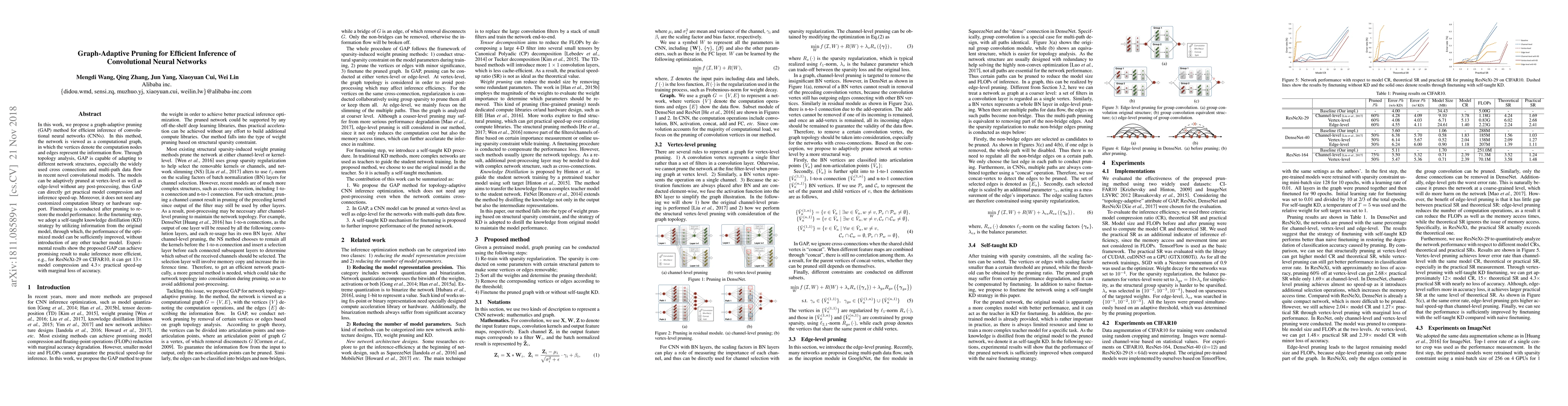 The research proposes Graph-Adaptive Pruning (GAP) for efficient inference of Convolutional Neural Networks (CNNs). GAP views the network as a computational graph and adapts to different structures, including cross connections and multi-path data flow. It prunes the network at vertex and edge levels without post-processing, achieving model compression and speed-up.