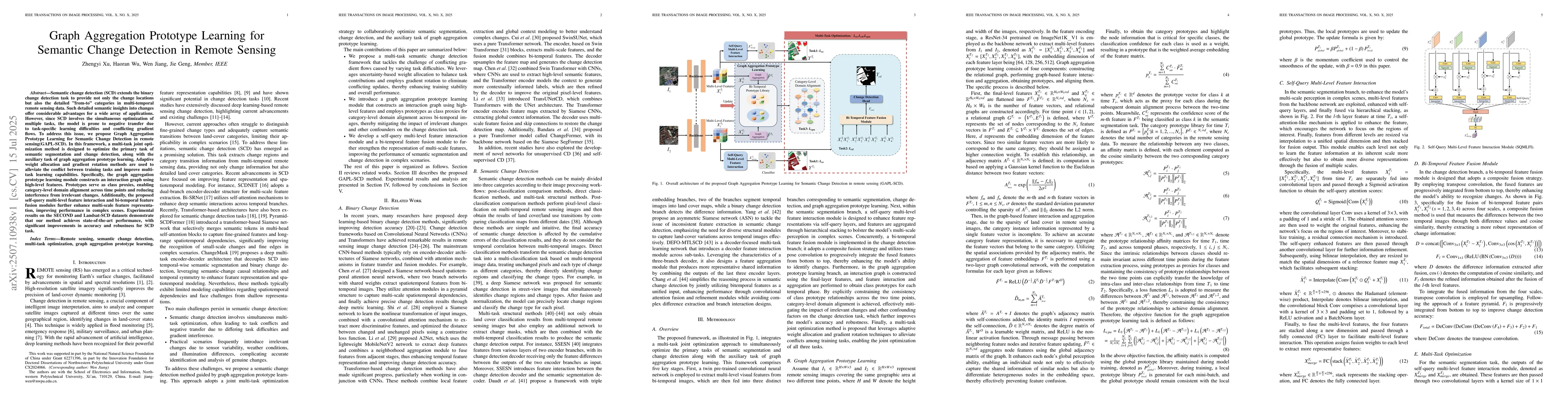 Semantic change detection (SCD) extends the binary change detection task to provide not only the change locations but also the detailed "from-to" categories in multi-temporal remote sensing data. Such detailed semantic insights into changes offer considerable advantages for a wide array of applications. However, since SCD involves the simultaneous optimization of multiple tasks, the model is prone to negative transfer due to task-specific learning difficulties and conflicting gradient flows. To address this issue, we propose Graph Aggregation Prototype Learning for Semantic Change Detection in remote sensing(GAPL-SCD). In this framework, a multi-task joint optimization method is designed to optimize the primary task of semantic segmentation and change detection, along with the auxiliary task of graph aggregation prototype learning. Adaptive weight allocation and gradient rotation methods are used to alleviate the conflict between training tasks and improve multi-task learning capabilities. Specifically, the graph aggregation prototype learning module constructs an interaction graph using high-level features. Prototypes serve as class proxies, enabling category-level domain alignment across time points and reducing interference from irrelevant changes. Additionally, the proposed self-query multi-level feature interaction and bi-temporal feature fusion modules further enhance multi-scale feature representation, improving performance in complex scenes. Experimental results on the SECOND and Landsat-SCD datasets demonstrate that our method achieves state-of-the-art performance, with significant improvements in accuracy and robustness for SCD task.