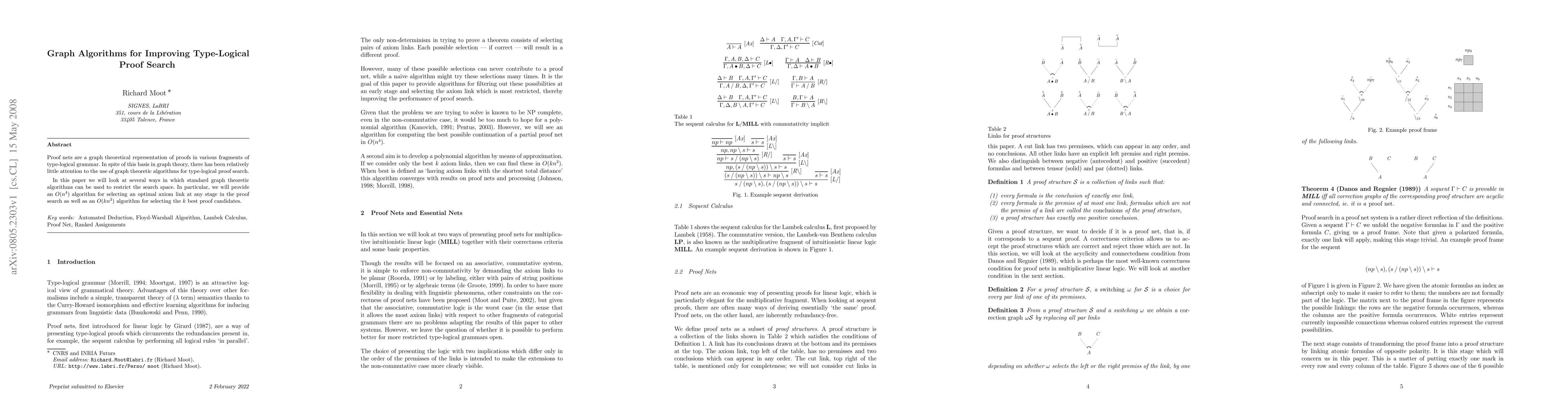 This paper introduces two graph algorithms to improve type-logical proof search: one for selecting an optimal axiom link in O(n^4) time and another for choosing the k best proof candidates in O(kn^3) time.