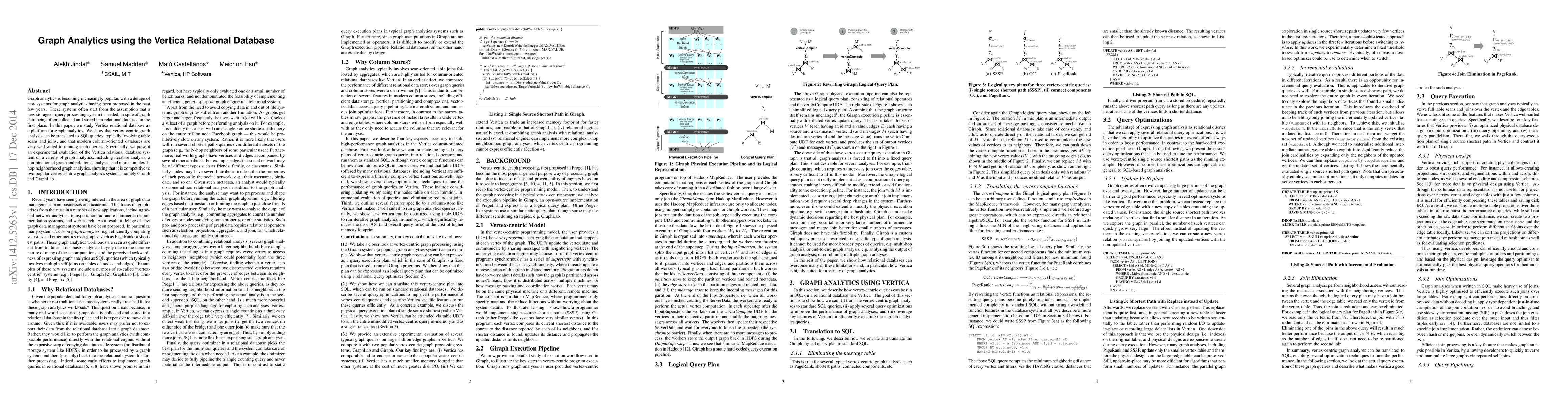 This paper explores using Vertica relational database for graph analytics, demonstrating that vertex-centric graph analysis can be efficiently translated into SQL queries. It shows Vertica's competitive performance against popular graph analytics systems like Giraph and GraphLab through experimental evaluations.