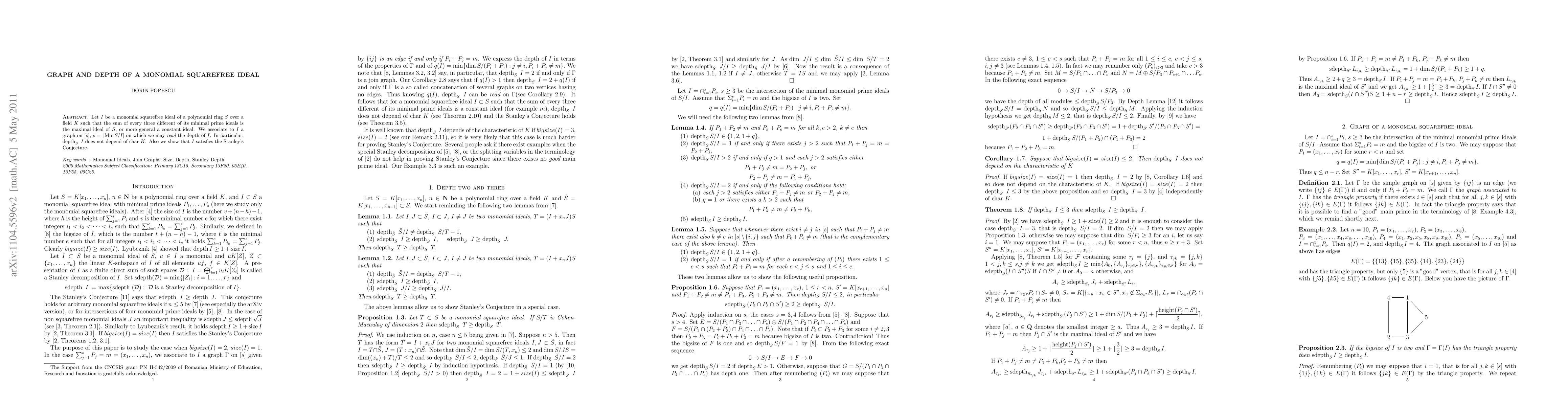 Let $I$ be a monomial squarefree ideal of a polynomial ring $S$ over a field $K$ such that the sum of every three different of its minimal prime ideals is the maximal ideal of $S$, or more general a constant ideal. We associate to $I$ a graph on $[s]$, $s=|\Min S/I|$ on which we may {\em read} the depth of $I$. In particular, $\depth_S\ I$ does not depend of char $K$. Also we show that $I$ satisfies the Stanley's Conjecture.