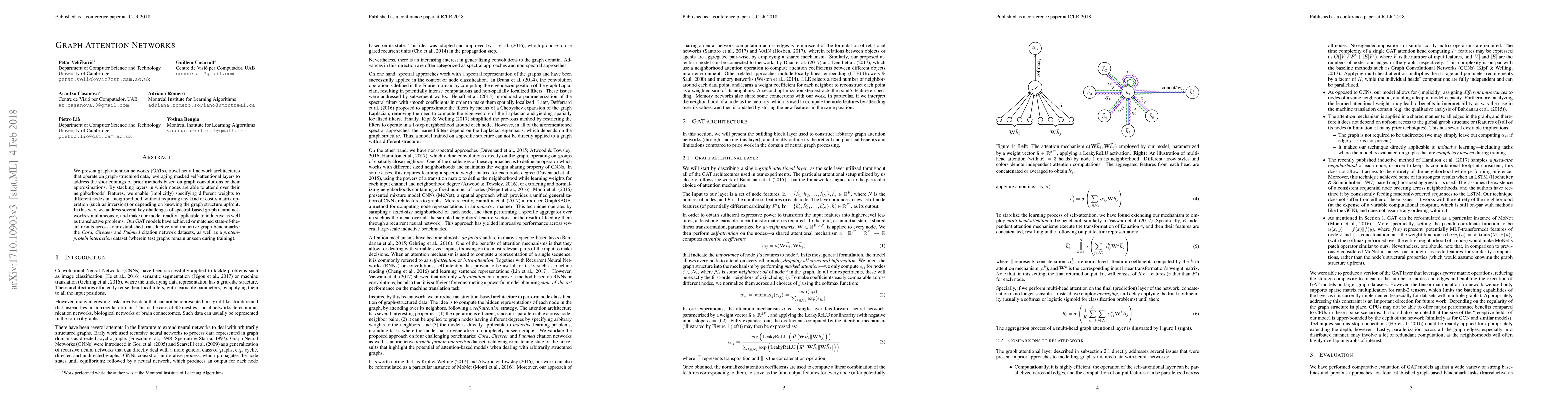 We present graph attention networks (GATs), novel neural network architectures that operate on graph-structured data, leveraging masked self-attentional layers to address the shortcomings of prior methods based on graph convolutions or their approximations. By stacking layers in which nodes are able to attend over their neighborhoods' features, we enable (implicitly) specifying different weights to different nodes in a neighborhood, without requiring any kind of costly matrix operation (such as inversion) or depending on knowing the graph structure upfront. In this way, we address several key challenges of spectral-based graph neural networks simultaneously, and make our model readily applicable to inductive as well as transductive problems. Our GAT models have achieved or matched state-of-the-art results across four established transductive and inductive graph benchmarks: the Cora, Citeseer and Pubmed citation network datasets, as well as a protein-protein interaction dataset (wherein test graphs remain unseen during training).