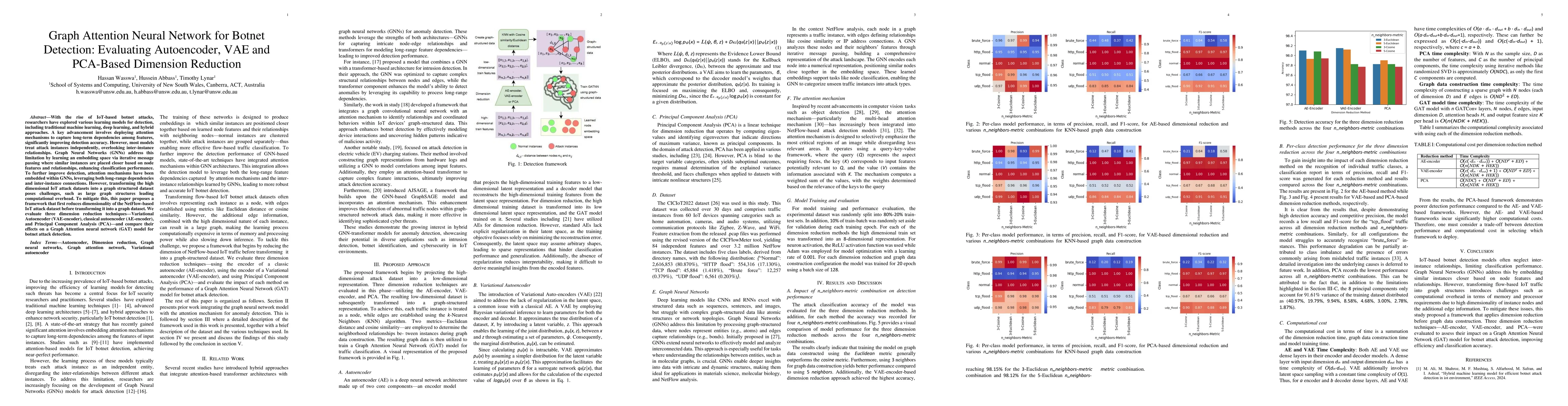 This paper proposes a Graph Attention Neural Network framework for detecting botnet attacks using dimension reduction techniques like VAE, AE, and PCA to transform IoT attack datasets into graph structured data.