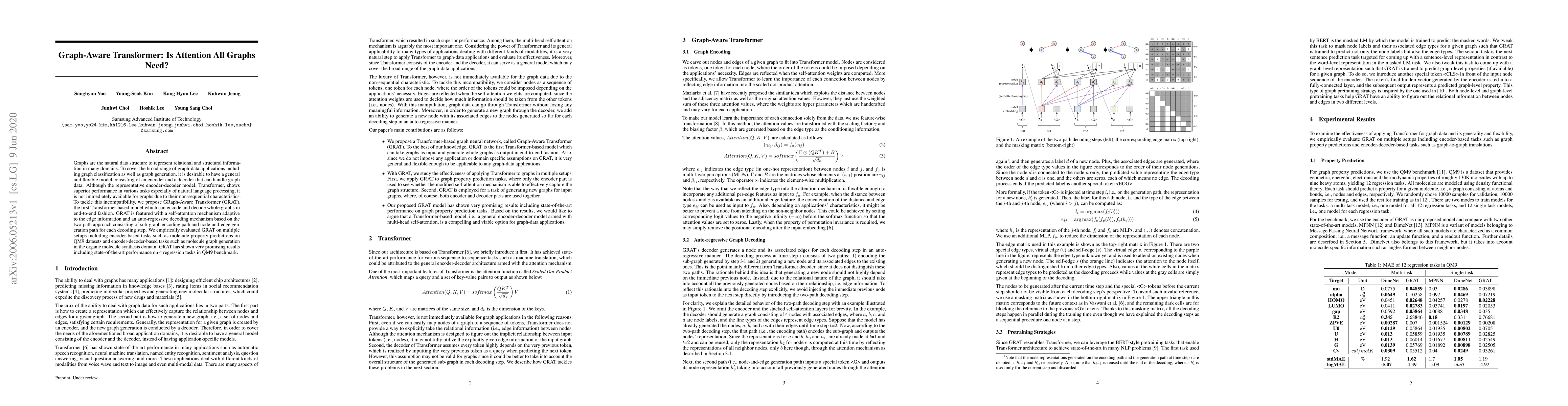 The paper proposes GRaph-Aware Transformer (GRAT), a novel Transformer-based model for graph data, featuring a self-attention mechanism adaptable to edge information and an auto-regressive decoding method. GRAT achieves state-of-the-art performance on molecule property predictions and graph generation tasks.
