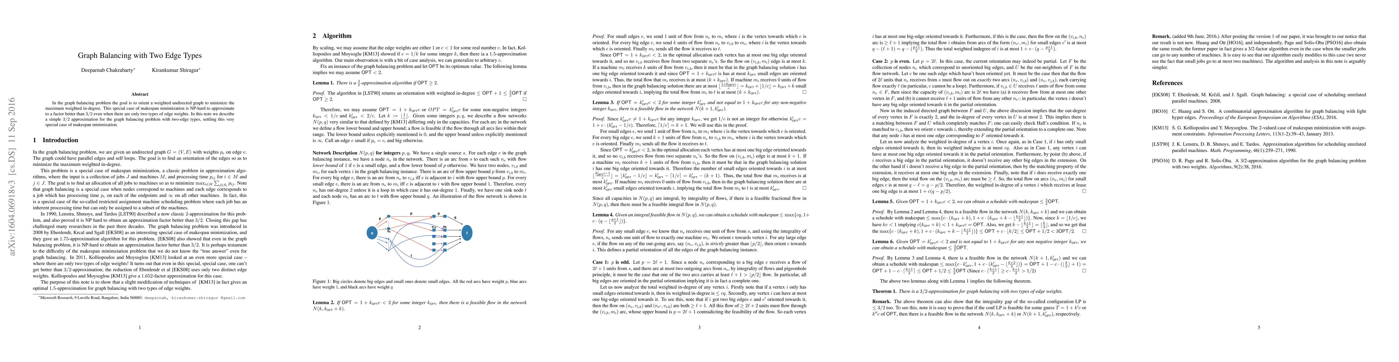 This paper presents a simple 3/2 approximation algorithm for the NP-hard graph balancing problem, where the goal is to orient a weighted undirected graph to minimize the maximum weighted in-degree, even when limited to two types of edge weights. The result settles this special case of makespan minimization.