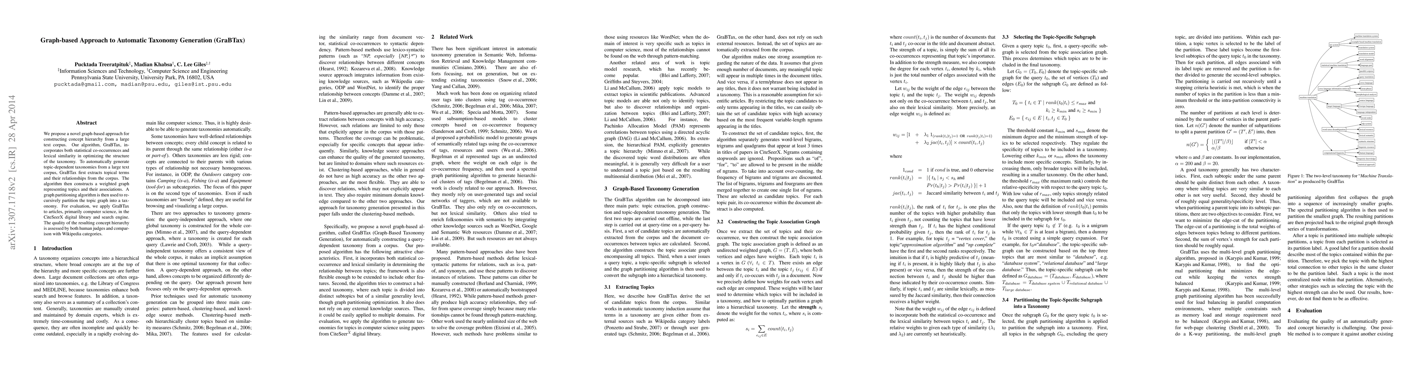 We propose a novel graph-based approach for constructing concept hierarchy from a large text corpus. Our algorithm, GraBTax, incorporates both statistical co-occurrences and lexical similarity in optimizing the structure of the taxonomy. To automatically generate topic-dependent taxonomies from a large text corpus, GraBTax first extracts topical terms and their relationships from the corpus. The algorithm then constructs a weighted graph representing topics and their associations. A graph partitioning algorithm is then used to recursively partition the topic graph into a taxonomy. For evaluation, we apply GraBTax to articles, primarily computer science, in the CiteSeerX digital library and search engine. The quality of the resulting concept hierarchy is assessed by both human judges and comparison with Wikipedia categories.
