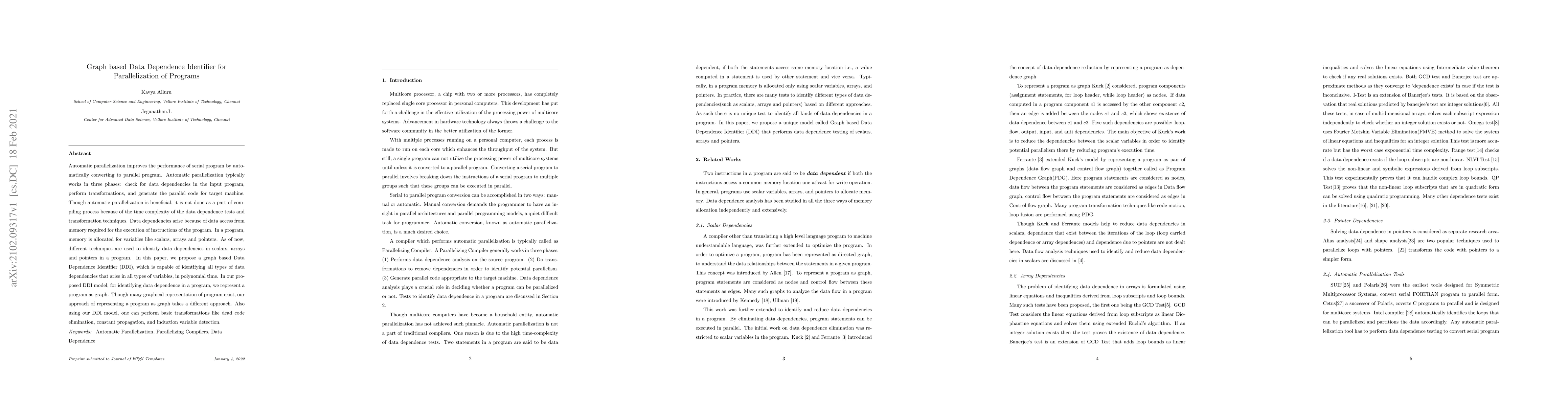 Automatic parallelization improves the performance of serial program by automatically converting to parallel program. Automatic parallelization typically works in three phases: check for data dependencies in the input program, perform transformations, and generate the parallel code for target machine. Though automatic parallelization is beneficial, it is not done as a part of compiling process because of the time complexity of the data dependence tests and transformation techniques. Data dependencies arise because of data access from memory required for the execution of instructions of the program. In a program, memory is allocated for variables like scalars, arrays and pointers. As of now, different techniques are used to identify data dependencies in scalars, arrays and pointers in a program. In this paper, we propose a graph based Data Dependence Identifier (DDI), which is capable of identifying all types of data dependencies that arise in all types of variables, in polynomial time. In our proposed DDI model, for identifying data dependence in a program, we represent a program as graph. Though many graphical representation of program exist, our approach of representing a program as graph takes a different approach. Also using our DDI model, one can perform basic transformations like dead code elimination, constant propagation, and induction variable detection.