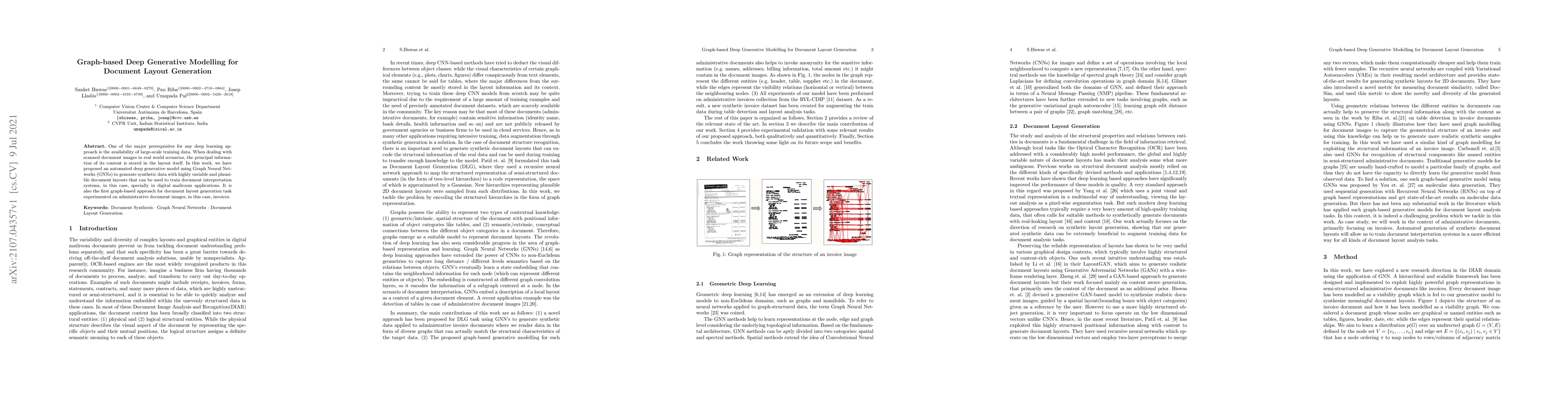 This paper proposes an automated deep generative model using Graph Neural Networks (GNNs) to create synthetic document layouts for training document interpretation systems, specifically for digital mailroom applications. It is the first graph-based approach for generating document layouts, tested on administrative document images like invoices.