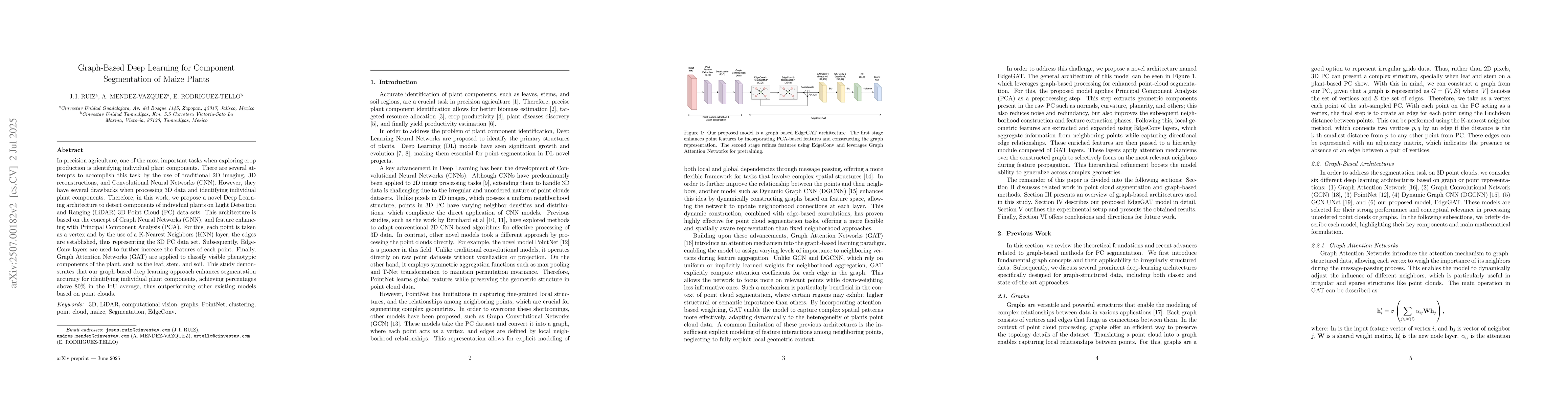 In precision agriculture, one of the most important tasks when exploring crop production is identifying individual plant components. There are several attempts to accomplish this task by the use of traditional 2D imaging, 3D reconstructions, and Convolutional Neural Networks (CNN). However, they have several drawbacks when processing 3D data and identifying individual plant components. Therefore, in this work, we propose a novel Deep Learning architecture to detect components of individual plants on Light Detection and Ranging (LiDAR) 3D Point Cloud (PC) data sets. This architecture is based on the concept of Graph Neural Networks (GNN), and feature enhancing with Principal Component Analysis (PCA). For this, each point is taken as a vertex and by the use of a K-Nearest Neighbors (KNN) layer, the edges are established, thus representing the 3D PC data set. Subsequently, Edge-Conv layers are used to further increase the features of each point. Finally, Graph Attention Networks (GAT) are applied to classify visible phenotypic components of the plant, such as the leaf, stem, and soil. This study demonstrates that our graph-based deep learning approach enhances segmentation accuracy for identifying individual plant components, achieving percentages above 80% in the IoU average, thus outperforming other existing models based on point clouds.