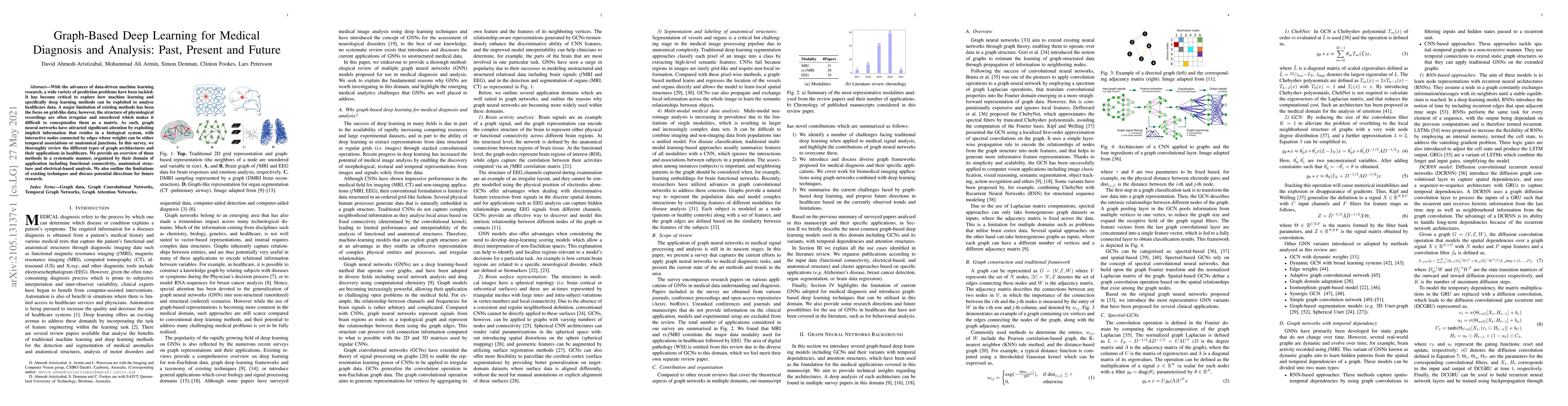 With the advances of data-driven machine learning research, a wide variety of prediction problems have been tackled. It has become critical to explore how machine learning and specifically deep learning methods can be exploited to analyse healthcare data. A major limitation of existing methods has been the focus on grid-like data; however, the structure of physiological recordings are often irregular and unordered which makes it difficult to conceptualise them as a matrix. As such, graph neural networks have attracted significant attention by exploiting implicit information that resides in a biological system, with interactive nodes connected by edges whose weights can be either temporal associations or anatomical junctions. In this survey, we thoroughly review the different types of graph architectures and their applications in healthcare. We provide an overview of these methods in a systematic manner, organized by their domain of application including functional connectivity, anatomical structure and electrical-based analysis. We also outline the limitations of existing techniques and discuss potential directions for future research.