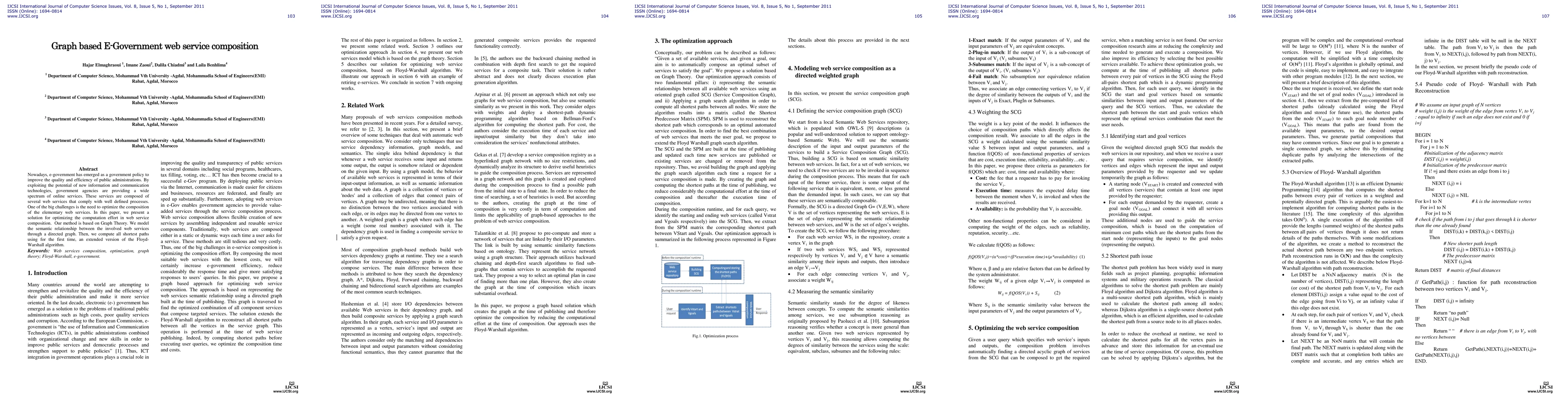 This paper proposes a graph-based method for optimizing the composition of e-government web services using Graph Theory. It models web service relationships via a directed graph and employs an extended Floyd-Warshall algorithm to compute shortest paths for efficient service composition.