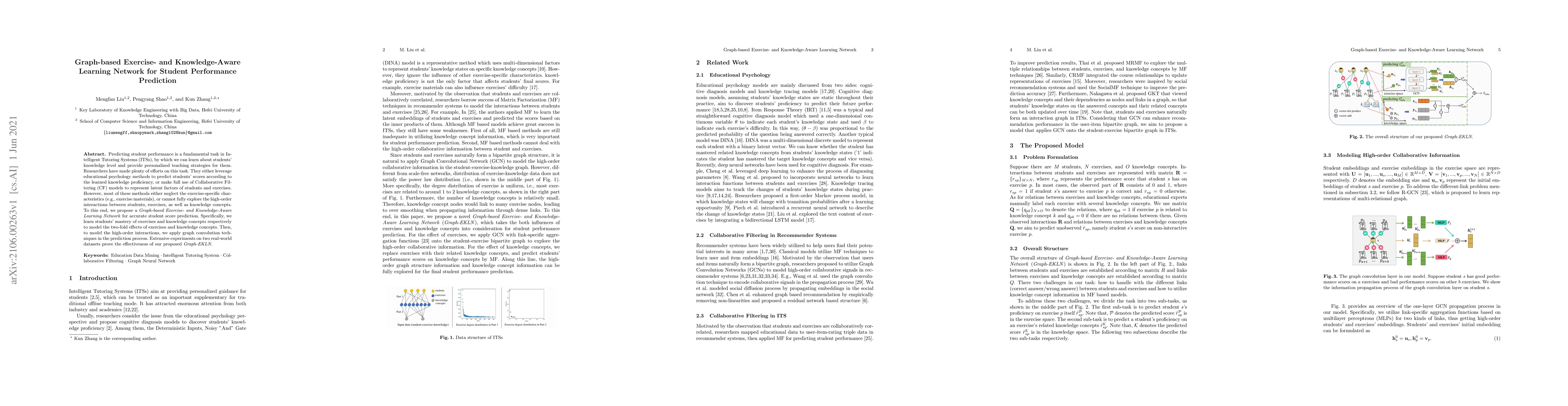 This paper proposes a Graph-based Exercise- and Knowledge-Aware Learning Network (Graph-EKLN) to predict student performance in Intelligent Tutoring Systems. The model captures exercise-specific characteristics and high-order interactions between students, exercises, and knowledge concepts using graph convolution techniques, outperforming existing methods.