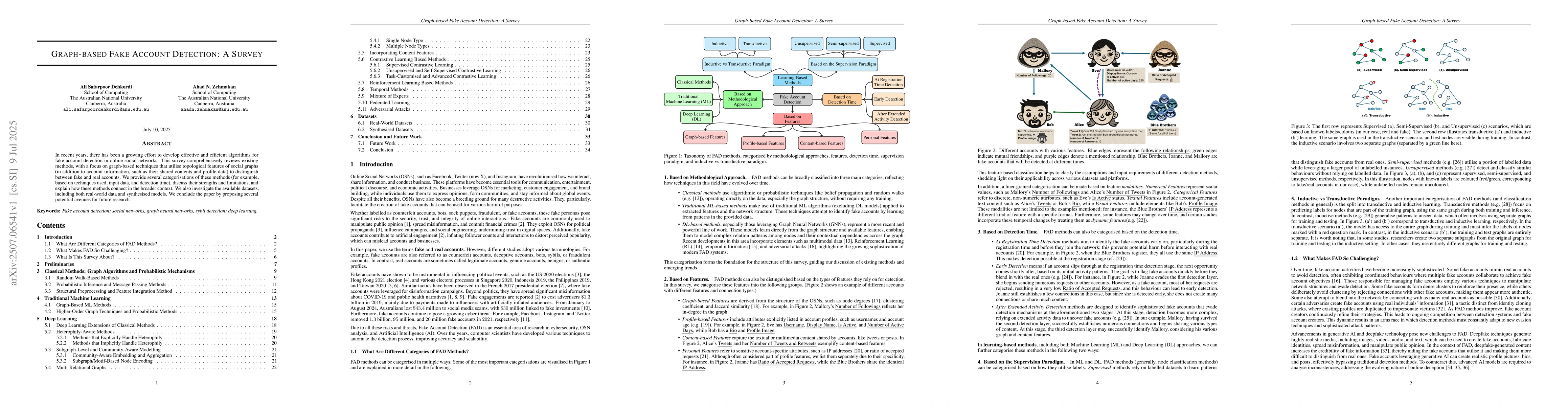 In recent years, there has been a growing effort to develop effective and efficient algorithms for fake account detection in online social networks. This survey comprehensively reviews existing methods, with a focus on graph-based techniques that utilise topological features of social graphs (in addition to account information, such as their shared contents and profile data) to distinguish between fake and real accounts. We provide several categorisations of these methods (for example, based on techniques used, input data, and detection time), discuss their strengths and limitations, and explain how these methods connect in the broader context. We also investigate the available datasets, including both real-world data and synthesised models. We conclude the paper by proposing several potential avenues for future research.