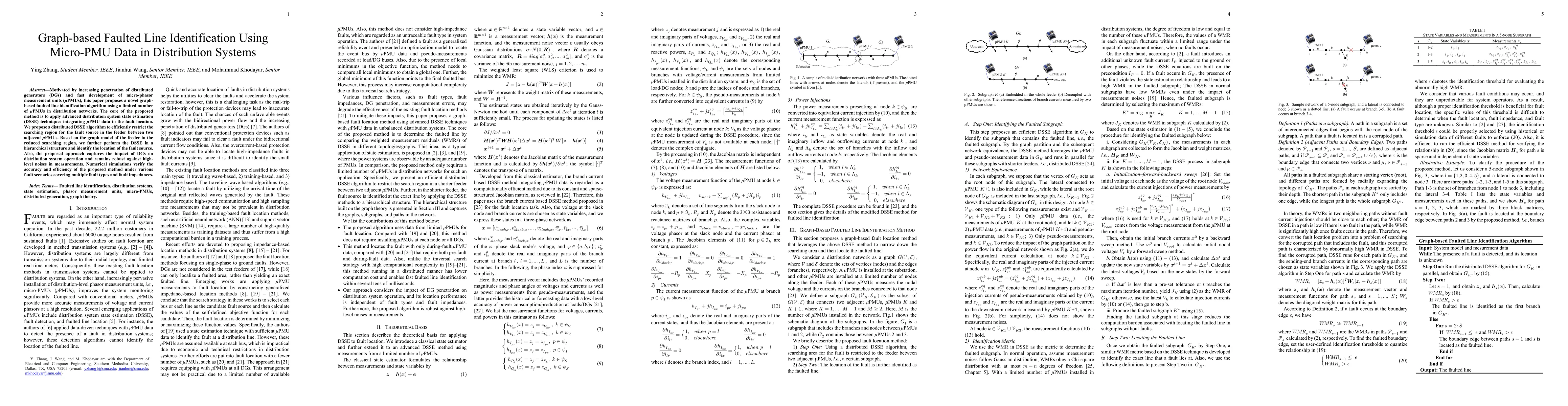 Motivated by increasing penetration of distributed generators (DGs) and fast development of micro-phasor measurement units ({\mu}PMUs), this paper proposes a novel graph-based faulted line identification algorithm using a limited number of {\mu}PMUs in distribution networks. The core of the proposed method is to apply advanced distribution system state estimation (DSSE) techniques integrating {\mu}PMU data to the fault location. We propose a distributed DSSE algorithm to efficiently restrict the searching region for the fault source in the feeder between two adjacent {\mu}PMUs. Based on the graph model of the feeder in the reduced searching region, we further perform the DSSE in a hierarchical structure and identify the location of the fault source. Also, the proposed approach captures the impact of DGs on distribution system operation and remains robust against high-level noises in measurements. Numerical simulations verify the accuracy and efficiency of the proposed method under various fault scenarios covering multiple fault types and fault impedances.
