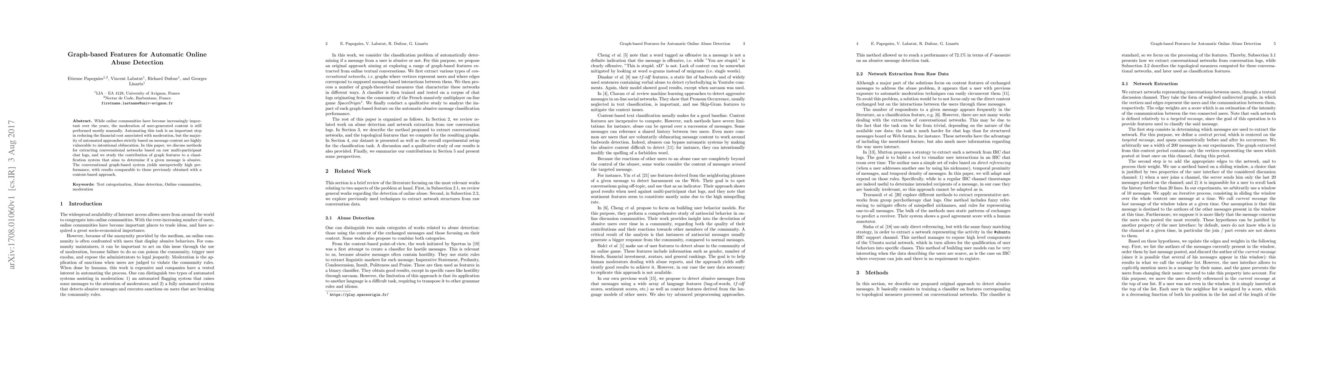While online communities have become increasingly important over the years, the moderation of user-generated content is still performed mostly manually. Automating this task is an important step in reducing the financial cost associated with moderation, but the majority of automated approaches strictly based on message content are highly vulnerable to intentional obfuscation. In this paper, we discuss methods for extracting conversational networks based on raw multi-participant chat logs, and we study the contribution of graph features to a classification system that aims to determine if a given message is abusive. The conversational graph-based system yields unexpectedly high performance , with results comparable to those previously obtained with a content-based approach.