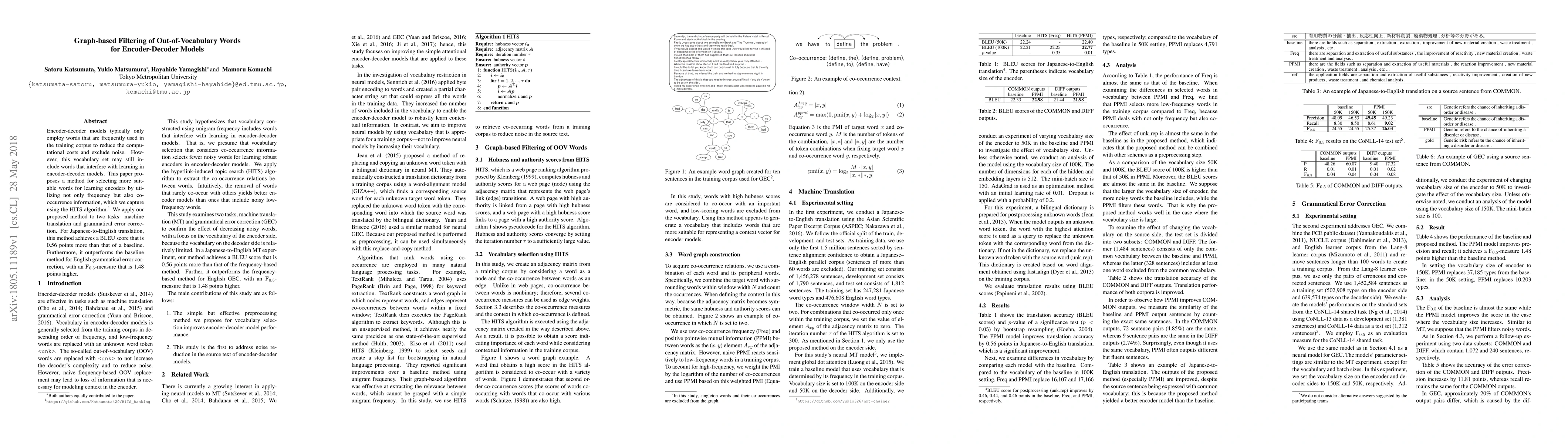 This paper introduces a graph-based filtering method using the HITS algorithm to select more suitable words for encoder-decoder models by considering both frequency and co-occurrence information. The method improves BLEU scores in Japanese-to-English translation and F0.5-measure in English grammatical error correction.