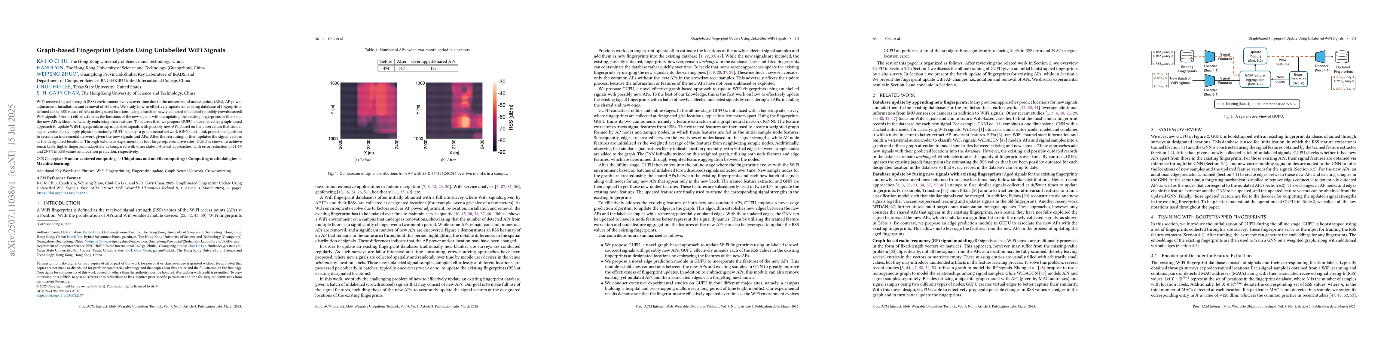 WiFi received signal strength (RSS) environment evolves over time due to movement of access points (APs), AP power adjustment, installation and removal of APs, etc. We study how to effectively update an existing database of fingerprints, defined as the RSS values of APs at designated locations, using a batch of newly collected unlabelled (possibly crowdsourced) WiFi signals. Prior art either estimates the locations of the new signals without updating the existing fingerprints or filters out the new APs without sufficiently embracing their features. To address that, we propose GUFU, a novel effective graph-based approach to update WiFi fingerprints using unlabelled signals with possibly new APs. Based on the observation that similar signal vectors likely imply physical proximity, GUFU employs a graph neural network (GNN) and a link prediction algorithm to retrain an incremental network given the new signals and APs. After the retraining, it then updates the signal vectors at the designated locations. Through extensive experiments in four large representative sites, GUFU is shown to achieve remarkably higher fingerprint adaptivity as compared with other state-of-the-art approaches, with error reduction of 21.4% and 29.8% in RSS values and location prediction, respectively.