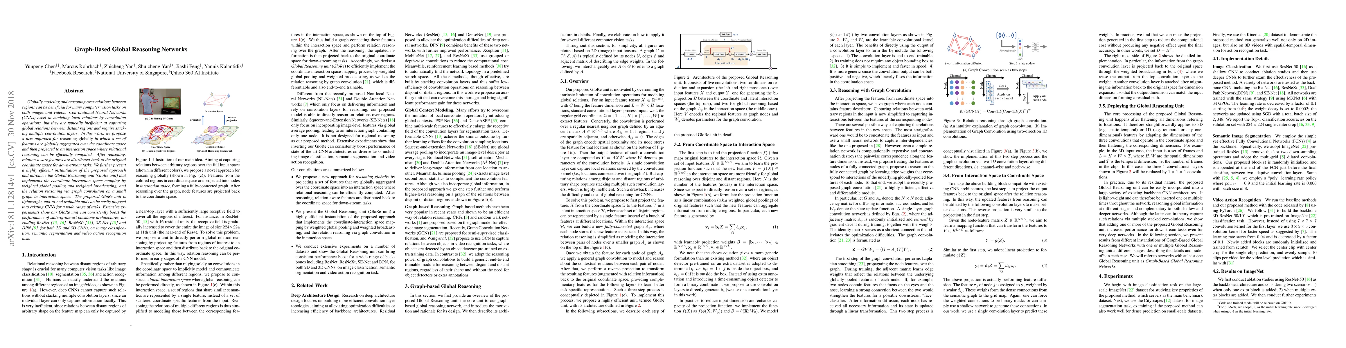 Globally modeling and reasoning over relations between regions can be beneficial for many computer vision tasks on both images and videos. Convolutional Neural Networks (CNNs) excel at modeling local relations by convolution operations, but they are typically inefficient at capturing global relations between distant regions and require stacking multiple convolution layers. In this work, we propose a new approach for reasoning globally in which a set of features are globally aggregated over the coordinate space and then projected to an interaction space where relational reasoning can be efficiently computed. After reasoning, relation-aware features are distributed back to the original coordinate space for down-stream tasks. We further present a highly efficient instantiation of the proposed approach and introduce the Global Reasoning unit (GloRe unit) that implements the coordinate-interaction space mapping by weighted global pooling and weighted broadcasting, and the relation reasoning via graph convolution on a small graph in interaction space. The proposed GloRe unit is lightweight, end-to-end trainable and can be easily plugged into existing CNNs for a wide range of tasks. Extensive experiments show our GloRe unit can consistently boost the performance of state-of-the-art backbone architectures, including ResNet, ResNeXt, SE-Net and DPN, for both 2D and 3D CNNs, on image classification, semantic segmentation and video action recognition task.