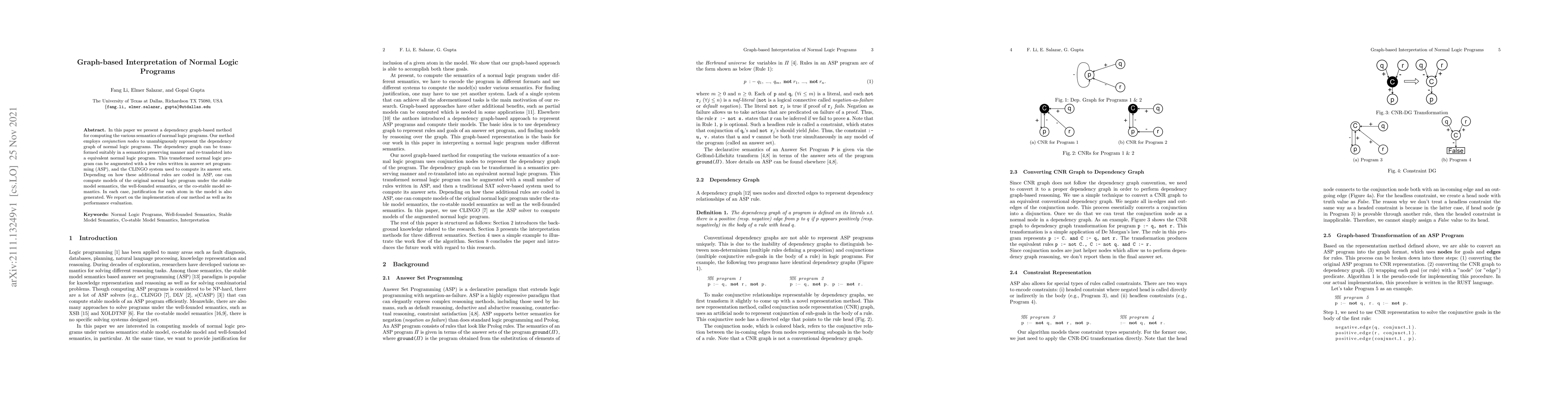 This paper proposes a graph-based method to compute various semantics of normal logic programs using dependency graphs represented by conjunction nodes. The method transforms these graphs to compute stable, well-founded, or co-stable models, with justifications for each atom, leveraging answer set programming and the CLINGO system.