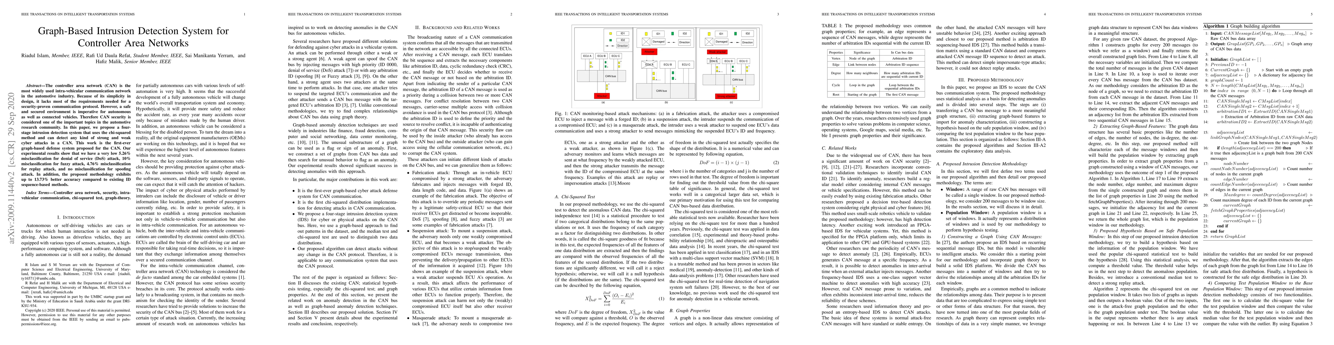 The controller area network (CAN) is the most widely used intra-vehicular communication network in the automotive industry. Because of its simplicity in design, it lacks most of the requirements needed for a security-proven communication protocol. However, a safe and secured environment is imperative for autonomous as well as connected vehicles. Therefore CAN security is considered one of the important topics in the automotive research community. In this paper, we propose a four-stage intrusion detection system that uses the chi-squared method and can detect any kind of strong and weak cyber attacks in a CAN. This work is the first-ever graph-based defense system proposed for the CAN. Our experimental results show that we have a very low 5.26% misclassification for denial of service (DoS) attack, 10% misclassification for fuzzy attack, 4.76% misclassification for replay attack, and no misclassification for spoofing attack. In addition, the proposed methodology exhibits up to 13.73% better accuracy compared to existing ID sequence-based methods.