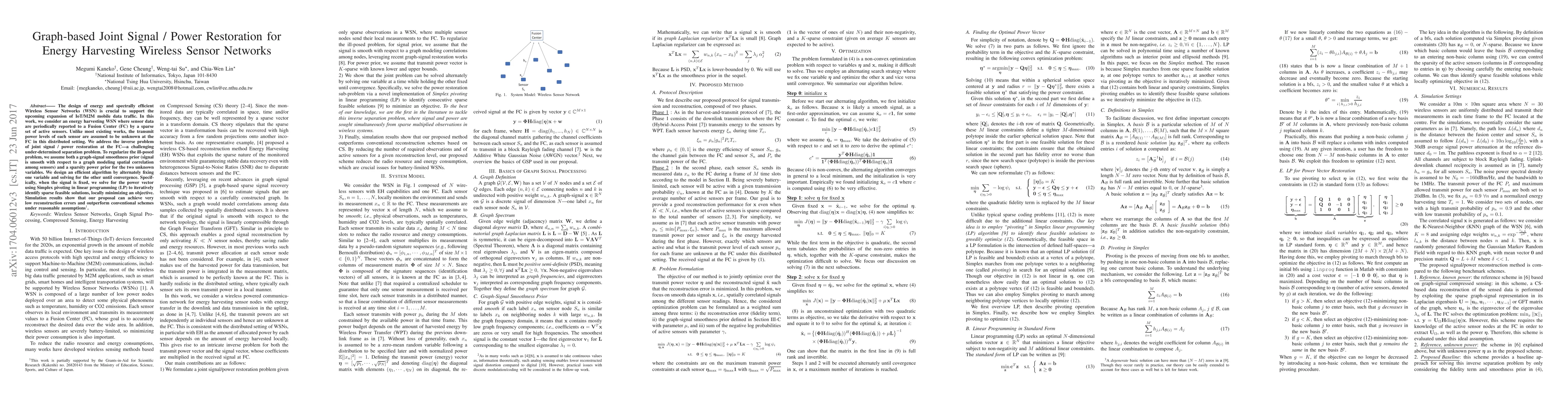 The design of energy and spectrally efficient Wireless Sensor Networks (WSN) is crucial to support the upcoming expansion of IoT/M2M mobile data traffic. In this work, we consider an energy harvesting WSN where sensor data are periodically reported to a Fusion Center (FC) by a sparse set of active sensors. Unlike most existing works, the transmit power levels of each sensor are assumed to be unknown at the FC in this distributed setting. We address the inverse problem of joint signal / power restoration at the FC- a challenging under-determined separation problem. To regularize the ill-posed problem, we assume both a graph-signal smoothness prior (signal is smooth with respect to a graph modeling spatial correlation among sensors) and a sparsity power prior for the two unknown variables. We design an efficient algorithm by alternately fixing one variable and solving for the other until convergence. Specifically, when the signal is fixed, we solve for the power vector using Simplex pivoting in linear programming (LP) to iteratively identify sparse feasible solutions, locally minimizing an objective. Simulation results show that our proposal can achieve very low reconstruction errors and outperform conventional schemes under reasonable assumptions