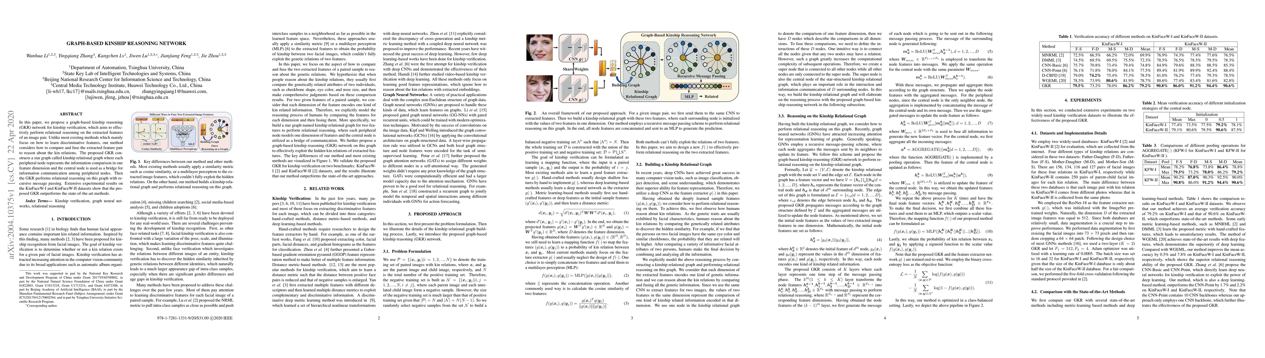 The paper proposes a graph-based kinship reasoning network (GKR) for verifying familial relationships by comparing and fusing image features through a star graph structure. The GKR network outperforms existing methods on KinFaceW-I and KinFaceW-II datasets.