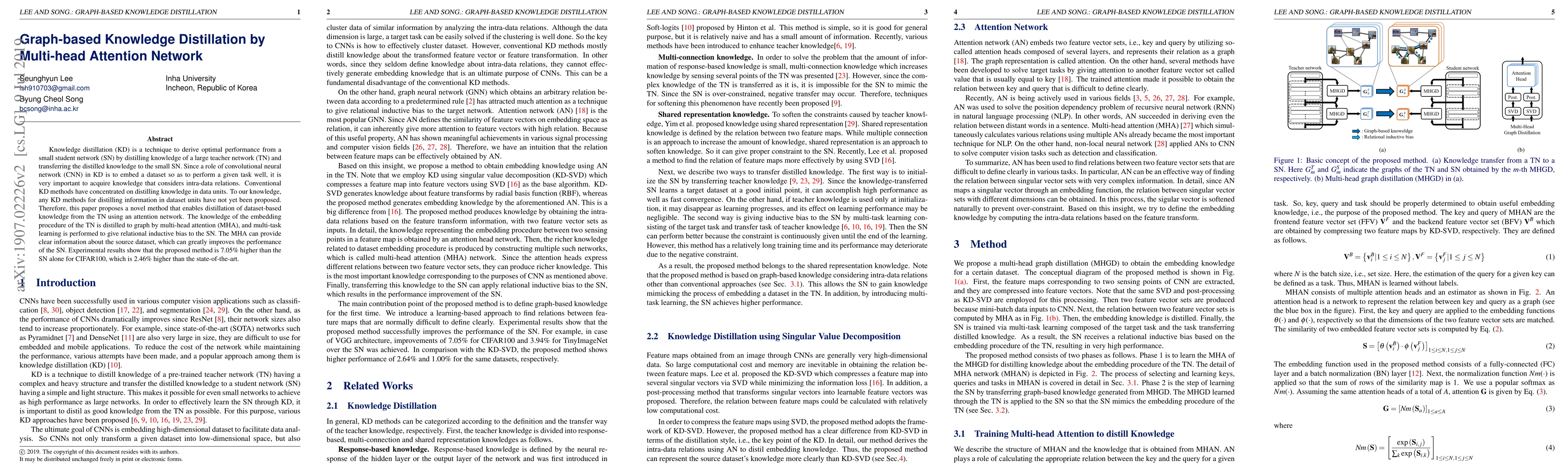 Knowledge distillation (KD) is a technique to derive optimal performance from a small student network (SN) by distilling knowledge of a large teacher network (TN) and transferring the distilled knowledge to the small SN. Since a role of convolutional neural network (CNN) in KD is to embed a dataset so as to perform a given task well, it is very important to acquire knowledge that considers intra-data relations. Conventional KD methods have concentrated on distilling knowledge in data units. To our knowledge, any KD methods for distilling information in dataset units have not yet been proposed. Therefore, this paper proposes a novel method that enables distillation of dataset-based knowledge from the TN using an attention network. The knowledge of the embedding procedure of the TN is distilled to graph by multi-head attention (MHA), and multi-task learning is performed to give relational inductive bias to the SN. The MHA can provide clear information about the source dataset, which can greatly improves the performance of the SN. Experimental results show that the proposed method is 7.05% higher than the SN alone for CIFAR100, which is 2.46% higher than the state-of-the-art.