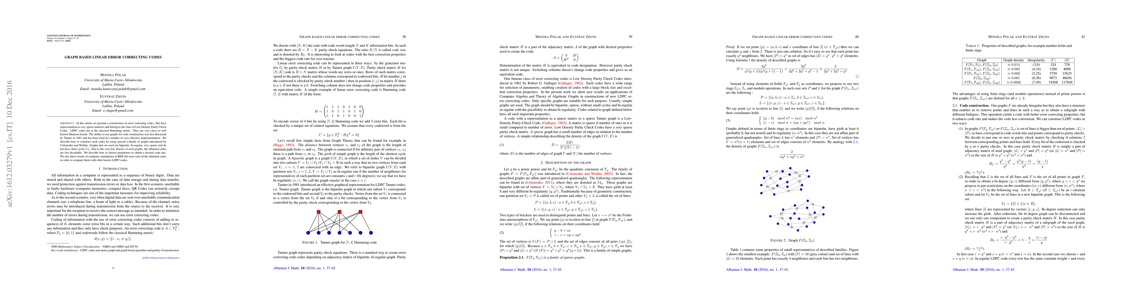 In this article we present a construction of error correcting codes, that have representation as very sparse matrices and belong to the class of Low Density Parity Check Codes. LDPC codes are in the classical Hamming metric. They are very close to well known Shannon bound. The ability to use graphs for code construction was first discussed by Tanner in 1981 and has been used in a number of very effective implementations. We describe how to construct such codes by using special a family of graphs introduced by Ustimenko and Woldar. Graphs that we used are bipartite, bi-regular, very sparse and do not have short cycles C 4 . Due to the very low density of such graphs, the obtained codes are fast decodable. We describe how to choose parameters to obtain a desired code rate. We also show results of computer simulations of BER (bit error rate) of the obtained codes in order to compare them with other known LDPC codes.