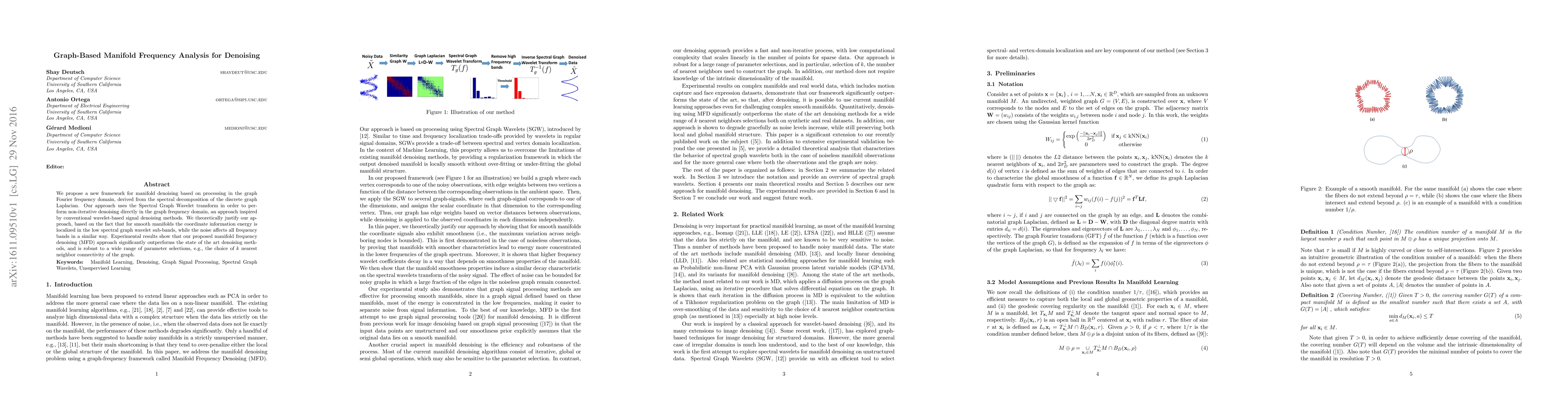 We propose a new framework for manifold denoising based on processing in the graph Fourier frequency domain, derived from the spectral decomposition of the discrete graph Laplacian. Our approach uses the Spectral Graph Wavelet transform in order to per- form non-iterative denoising directly in the graph frequency domain, an approach inspired by conventional wavelet-based signal denoising methods. We theoretically justify our approach, based on the fact that for smooth manifolds the coordinate information energy is localized in the low spectral graph wavelet sub-bands, while the noise affects all frequency bands in a similar way. Experimental results show that our proposed manifold frequency denoising (MFD) approach significantly outperforms the state of the art denoising meth- ods, and is robust to a wide range of parameter selections, e.g., the choice of k nearest neighbor connectivity of the graph.