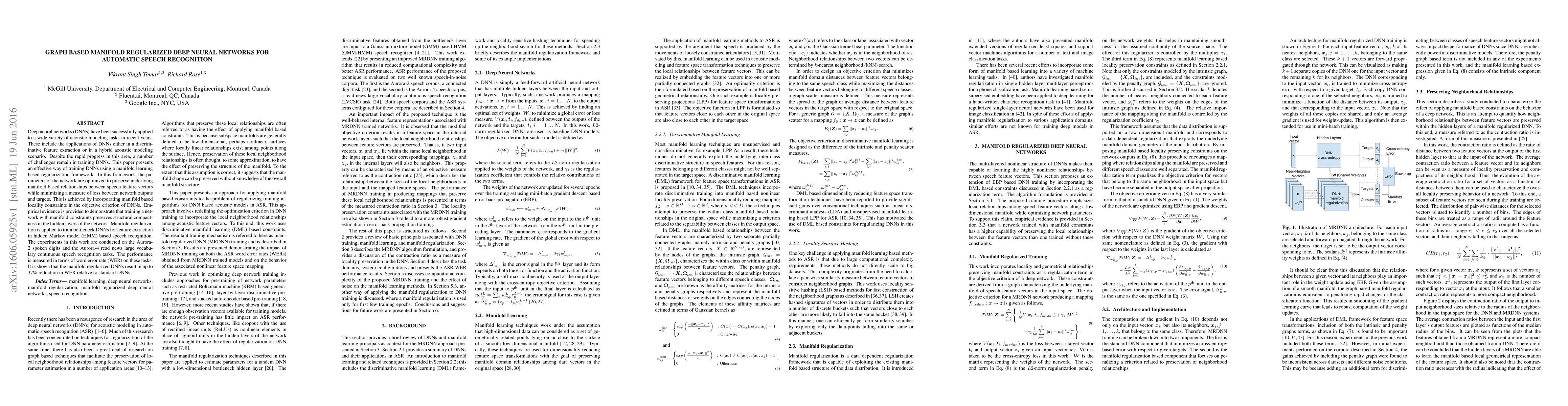 This paper proposes a new method for training deep neural networks using manifold regularization to preserve underlying relationships between speech feature vectors, resulting in up to 37% improvement in automatic speech recognition performance.