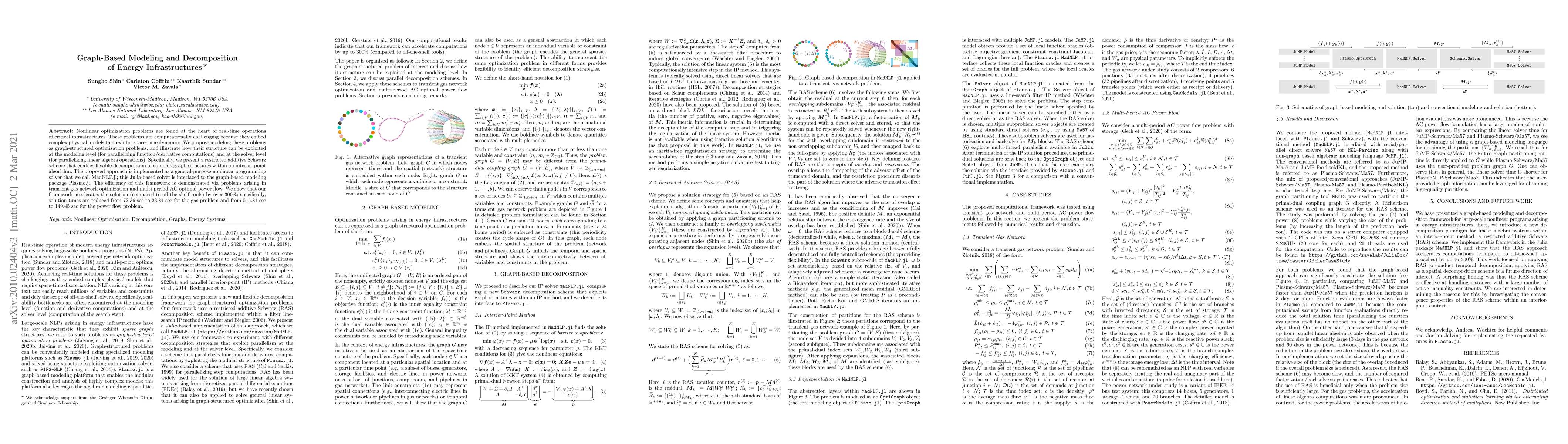 This paper proposes a graph-based modeling and decomposition approach to solve computationally challenging nonlinear optimization problems in energy infrastructures. The method, implemented in MadNLP.jl, significantly accelerates solutions for transient gas network and multi-period AC optimal power flow problems, reducing solution times by over 300%.