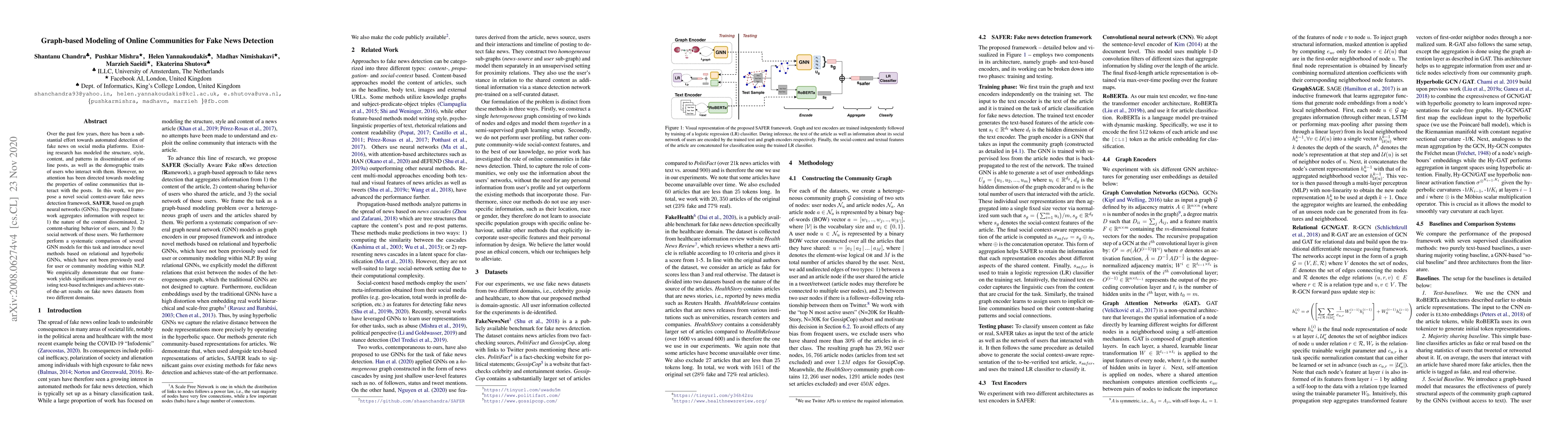 This paper proposes SAFER, a novel graph-based framework using graph neural networks to detect fake news by modeling online communities' properties, content dissemination, and user interaction patterns, achieving state-of-the-art results compared to existing text-based techniques.