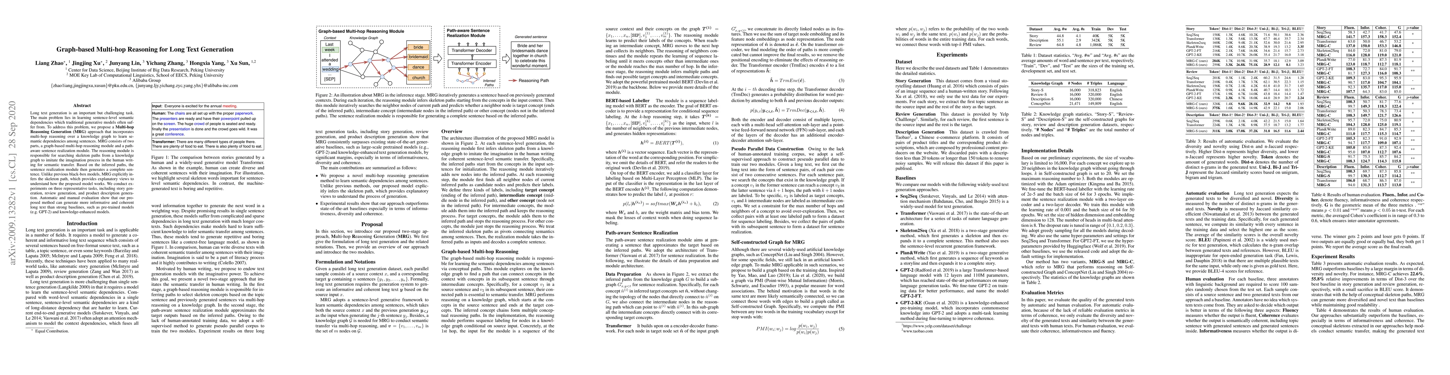 This paper proposes a Multi-hop Reasoning Generation (MRG) approach for long text generation, leveraging multi-hop reasoning over a knowledge graph to learn sentence-level semantic dependencies. The method includes a graph-based reasoning module and a path-aware sentence realization module, generating more informative and coherent long texts compared to baselines.