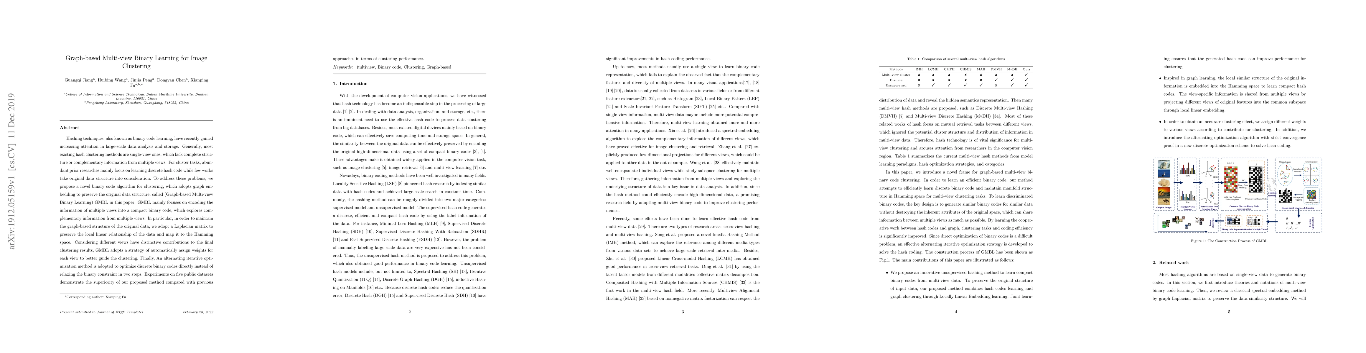 Graph-based Multi-view Binary Learning (GMBL) is a new clustering algorithm that uses graph embedding to preserve original data structure and generates compact binary codes from multiple views, outperforming existing methods on public datasets.