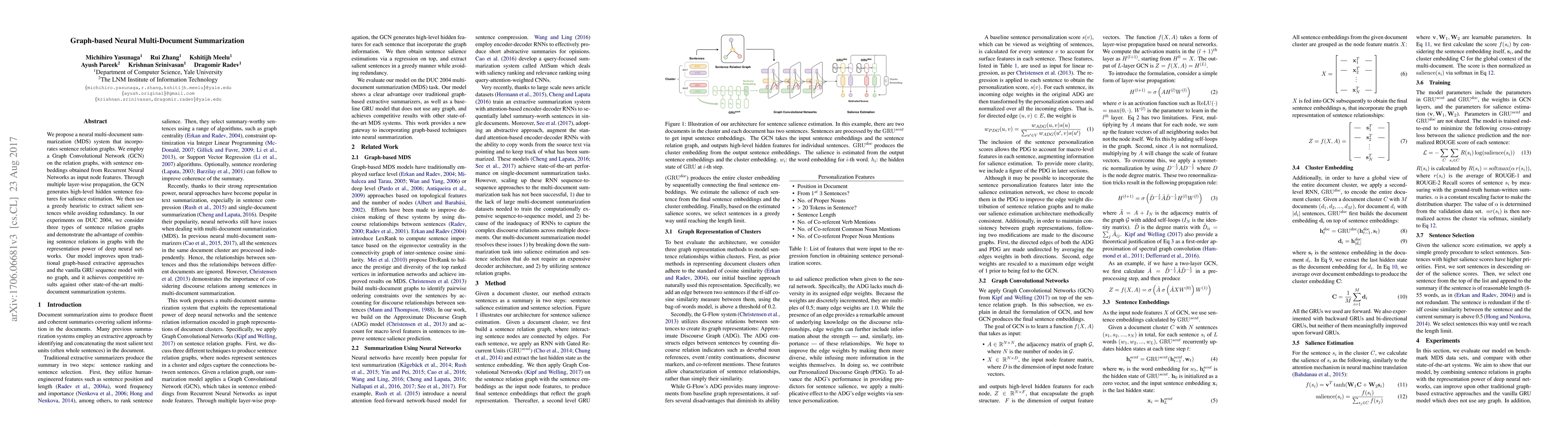 This paper introduces a neural multi-document summarization system that uses sentence relation graphs and Graph Convolutional Networks (GCN) to enhance sentence feature extraction. The model outperforms traditional graph-based methods and achieves competitive results against other state-of-the-art systems.