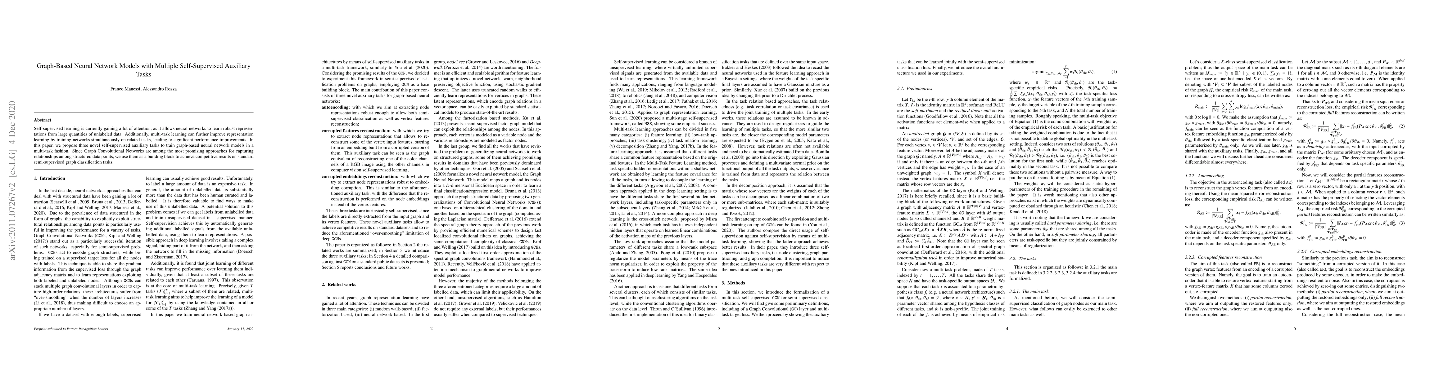 This paper proposes three new self-supervised auxiliary tasks to enhance graph-based neural network models through multi-task learning. Utilizing Graph Convolutional Networks, the approach achieves competitive results on standard semi-supervised graph classification tasks, leveraging large amounts of unlabeled data.