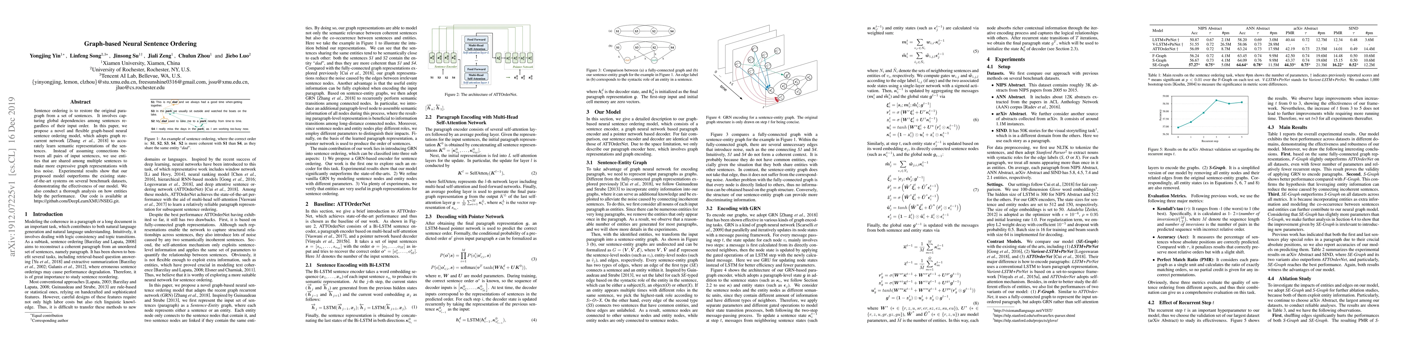 This paper introduces a graph-based neural model for sentence ordering, utilizing graph recurrent networks to learn semantic representations based on shared entities among sentences. The model outperforms existing methods, highlighting the benefits of entity-based graph representations.