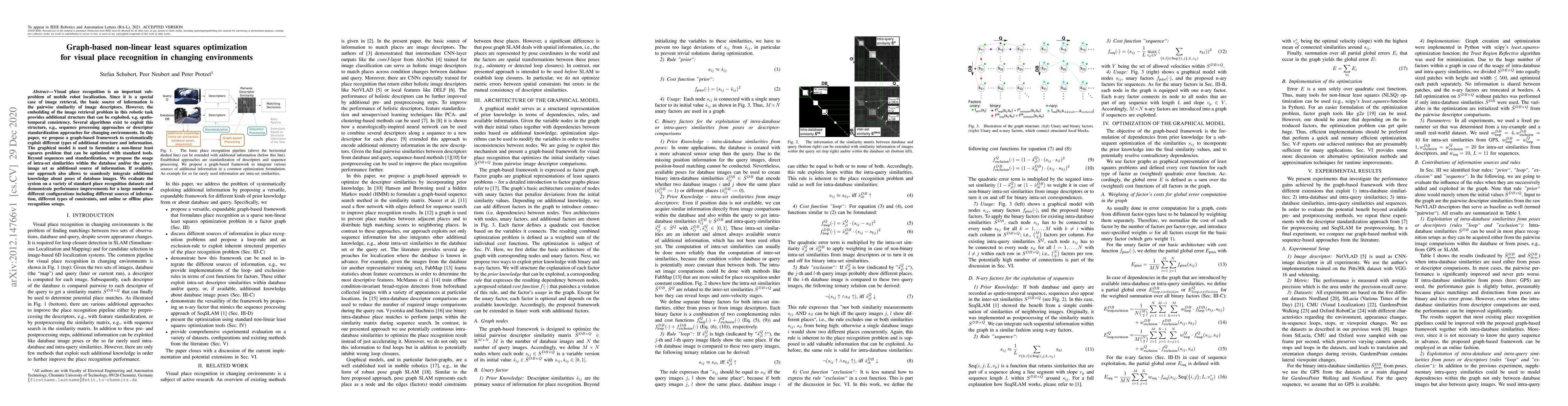 This paper proposes a graph-based non-linear least squares optimization framework for visual place recognition in dynamic environments, leveraging spatio-temporal consistency and intra-set similarities for improved performance. The method is evaluated across various datasets, showing enhanced results under different configurations.