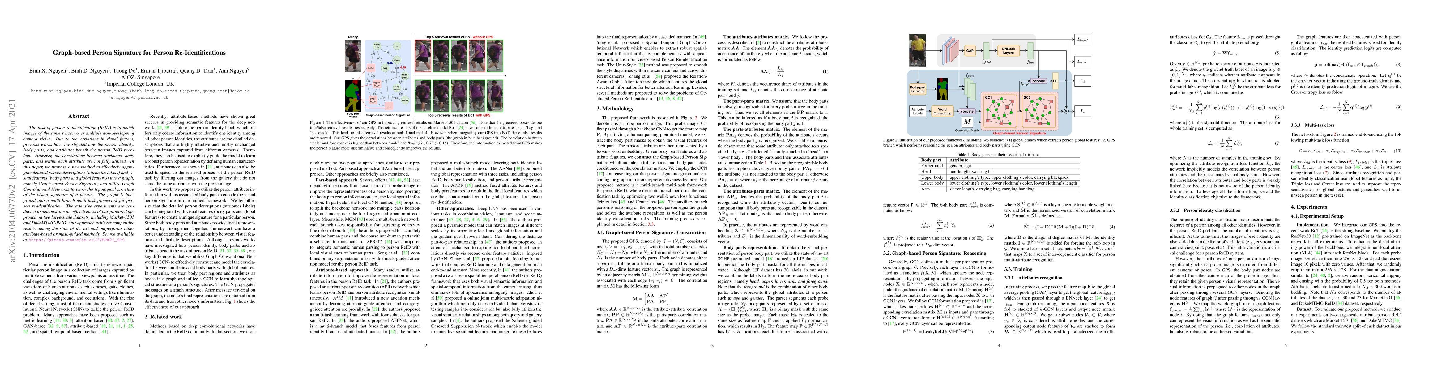 A new method proposes a graph-based person signature for person re-identification, combining attributes, body parts, and visual features to achieve competitive results on large-scale datasets.