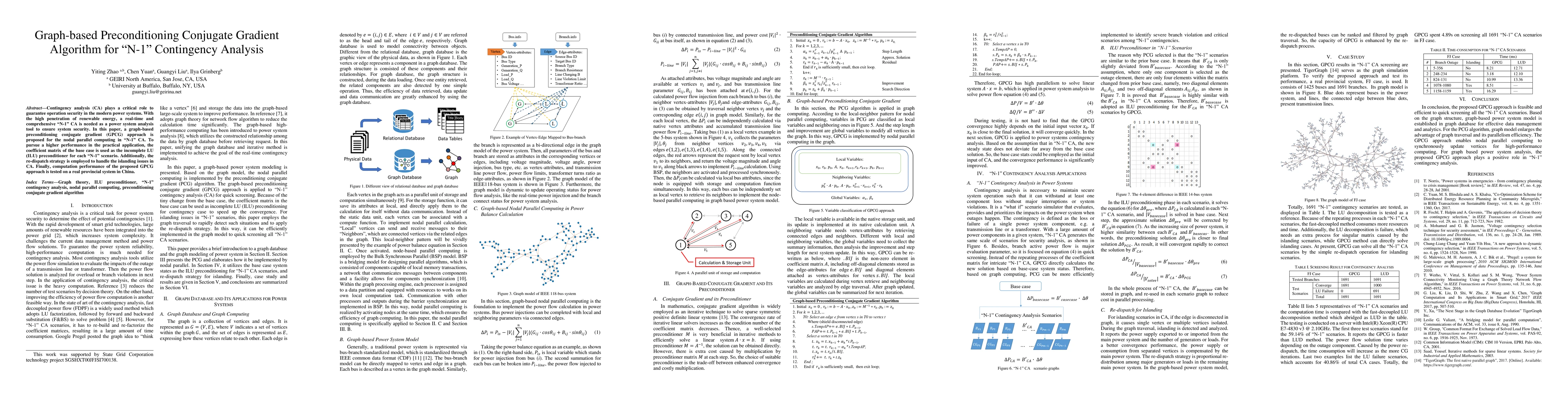 This paper proposes a graph-based preconditioning conjugate gradient (GPCG) algorithm for efficient N-1 contingency analysis in power systems, utilizing an incomplete LU preconditioner and a re-dispatch strategy to handle islanding issues. The method is tested on a real provincial system in China, demonstrating improved computational performance.