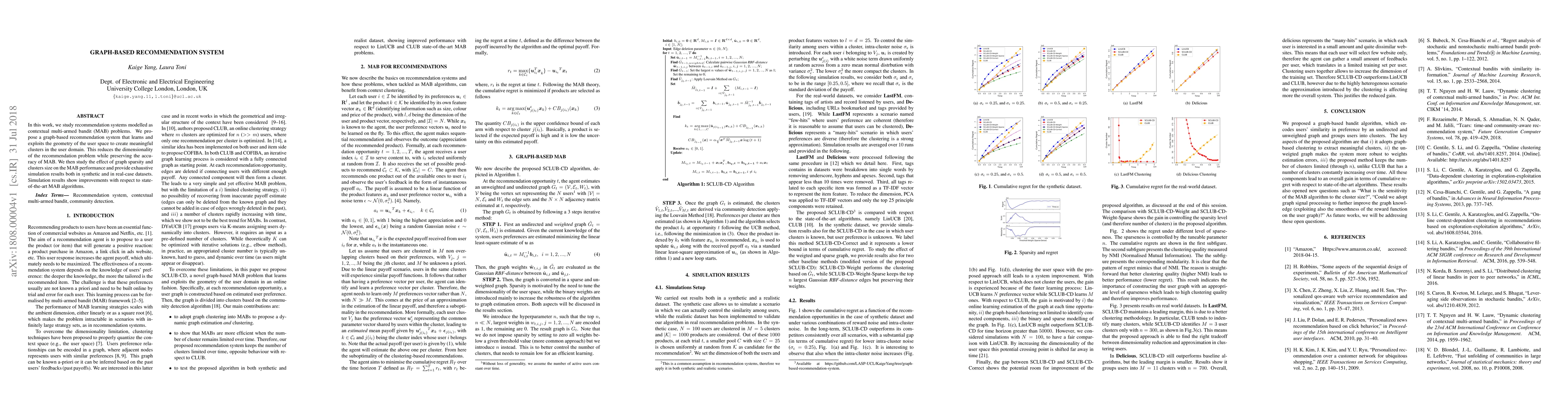 In this work, we study recommendation systems modelled as contextual multi-armed bandit (MAB) problems. We propose a graph-based recommendation system that learns and exploits the geometry of the user space to create meaningful clusters in the user domain. This reduces the dimensionality of the recommendation problem while preserving the accuracy of MAB. We then study the effect of graph sparsity and clusters size on the MAB performance and provide exhaustive simulation results both in synthetic and in real-case datasets. Simulation results show improvements with respect to state-of-the-art MAB algorithms.