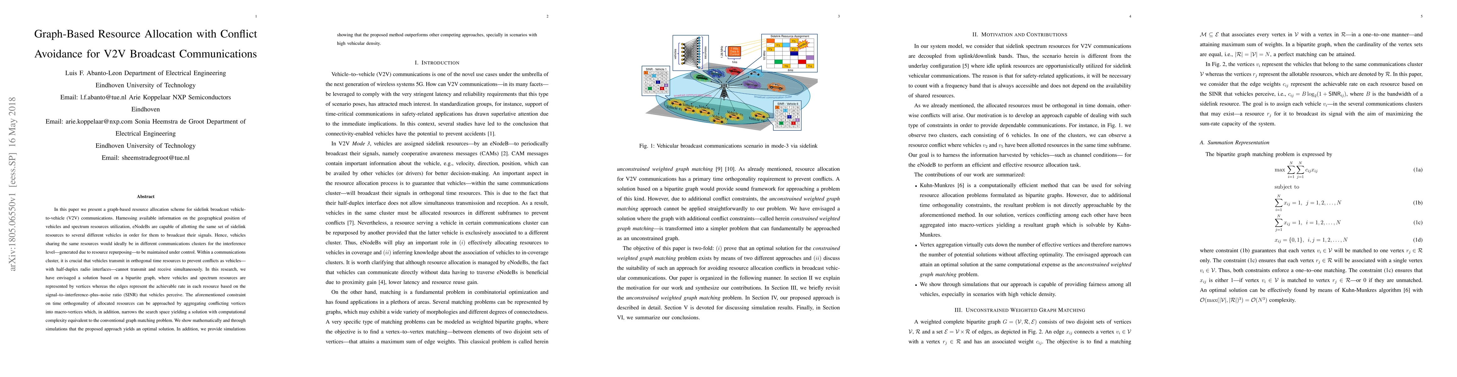 In this paper we present a graph-based resource allocation scheme for sidelink broadcast vehicle-to-vehicle (V2V) communications. Harnessing available information on the geographical position of vehicles and spectrum resources utilization, eNodeBs are capable of allotting the same set of sidelink resources to several different vehicles in order for them to broadcast their signals. Hence, vehicles sharing the same resources would ideally be in different communications clusters for the interference level-generated due to resource repurposing-to be maintained under control. Within a communications cluster, it is crucial that vehicles transmit in orthogonal time resources to prevent conflicts as vehicles-with half-duplex radio interfaces--cannot transmit and receive simultaneously. In this research, we have envisaged a solution based on a bipartite graph, where vehicles and spectrum resources are represented by vertices whereas the edges represent the achievable rate in each resource based on the signal-to-interference-plus-noise ratio (SINR) that vehicles perceive. The aforementioned constraint on time orthogonality of allocated resources can be approached by aggregating conflicting vertices into macro-vertices which, in addition, narrows the search space yielding a solution with computational complexity equivalent to the conventional graph matching problem. We show mathematically and through simulations that the proposed approach yields an optimal solution. In addition, we provide simulations showing that the proposed method outperforms other competing approaches, specially in scenarios with high vehicular density.