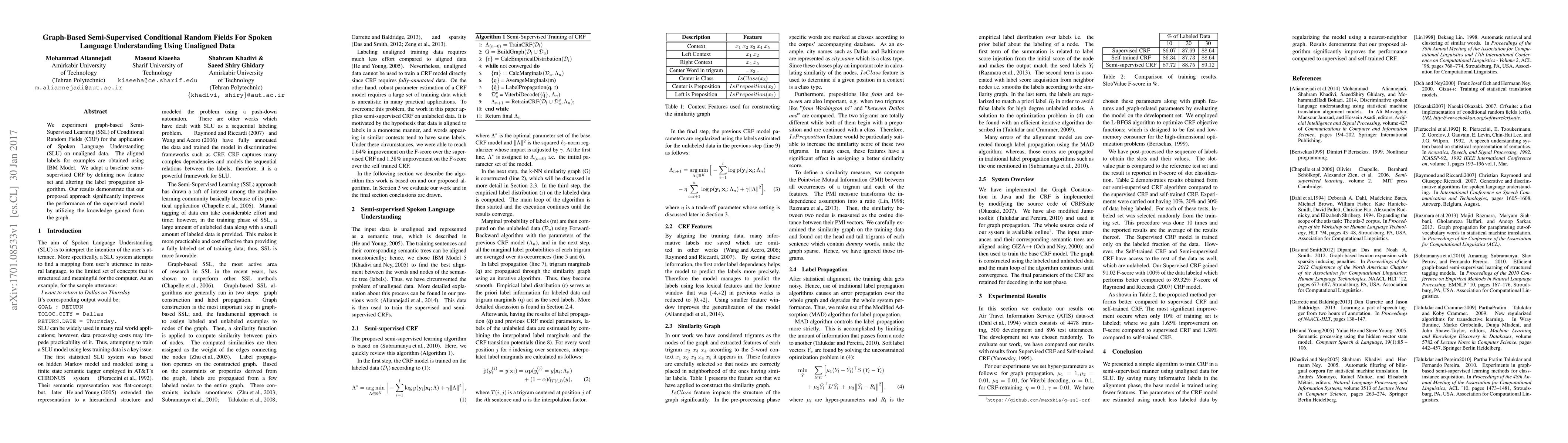 This paper proposes a graph-based Semi-Supervised Learning approach for Conditional Random Fields to enhance Spoken Language Understanding using unaligned data. The method improves performance by leveraging unlabeled data through a new feature set and modified label propagation.