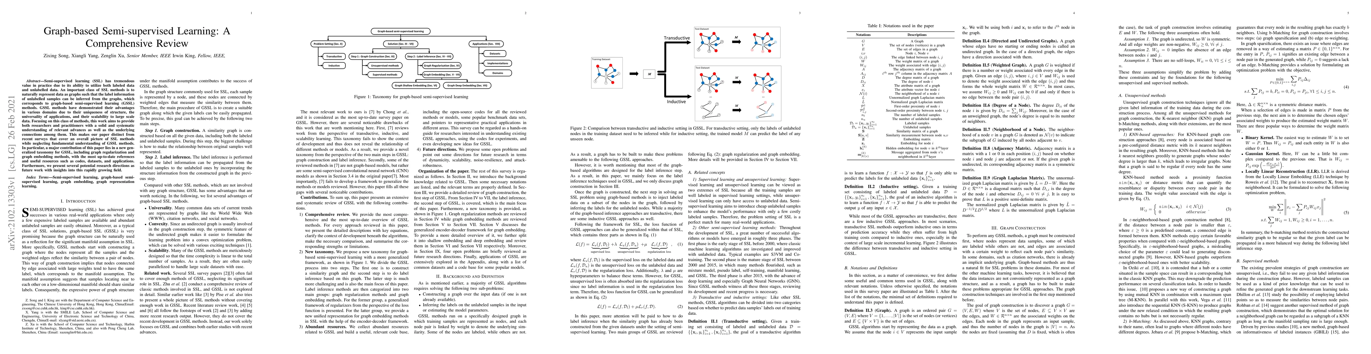 This paper provides a comprehensive review of graph-based semi-supervised learning (GSSL) methods, offering a new generalized taxonomy that includes graph regularization and graph embedding techniques. It aims to deepen understanding of GSSL's unique advantages and applications, offering resources and insights for future research directions.