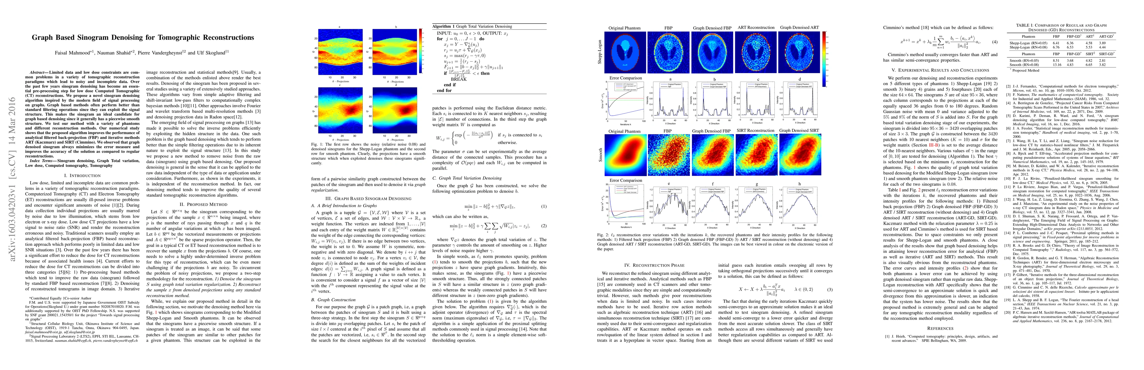 Limited data and low dose constraints are common problems in a variety of tomographic reconstruction paradigms which lead to noisy and incomplete data. Over the past few years sinogram denoising has become an essential pre-processing step for low dose Computed Tomographic (CT) reconstructions. We propose a novel sinogram denoising algorithm inspired by the modern field of signal processing on graphs. Graph based methods often perform better than standard filtering operations since they can exploit the signal structure. This makes the sinogram an ideal candidate for graph based denoising since it generally has a piecewise smooth structure. We test our method with a variety of phantoms and different reconstruction methods. Our numerical study shows that the proposed algorithm improves the performance of analytical filtered back-projection (FBP) and iterative methods ART (Kaczmarz) and SIRT (Cimmino).We observed that graph denoised sinogram always minimizes the error measure and improves the accuracy of the solution as compared to regular reconstructions.