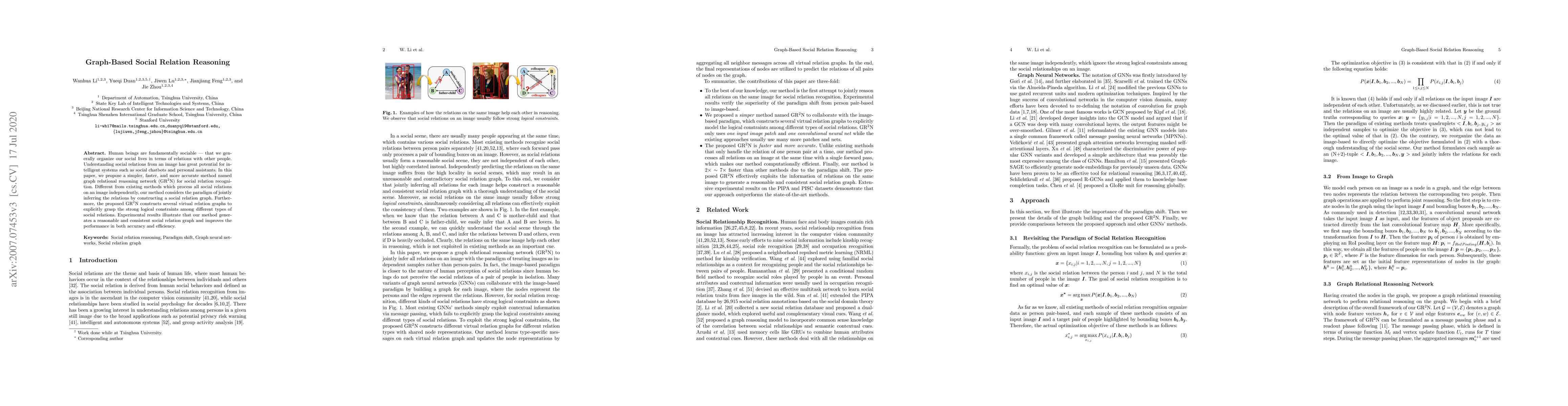 Human beings are fundamentally sociable -- that we generally organize our social lives in terms of relations with other people. Understanding social relations from an image has great potential for intelligent systems such as social chatbots and personal assistants. In this paper, we propose a simpler, faster, and more accurate method named graph relational reasoning network (GR2N) for social relation recognition. Different from existing methods which process all social relations on an image independently, our method considers the paradigm of jointly inferring the relations by constructing a social relation graph. Furthermore, the proposed GR2N constructs several virtual relation graphs to explicitly grasp the strong logical constraints among different types of social relations. Experimental results illustrate that our method generates a reasonable and consistent social relation graph and improves the performance in both accuracy and efficiency.