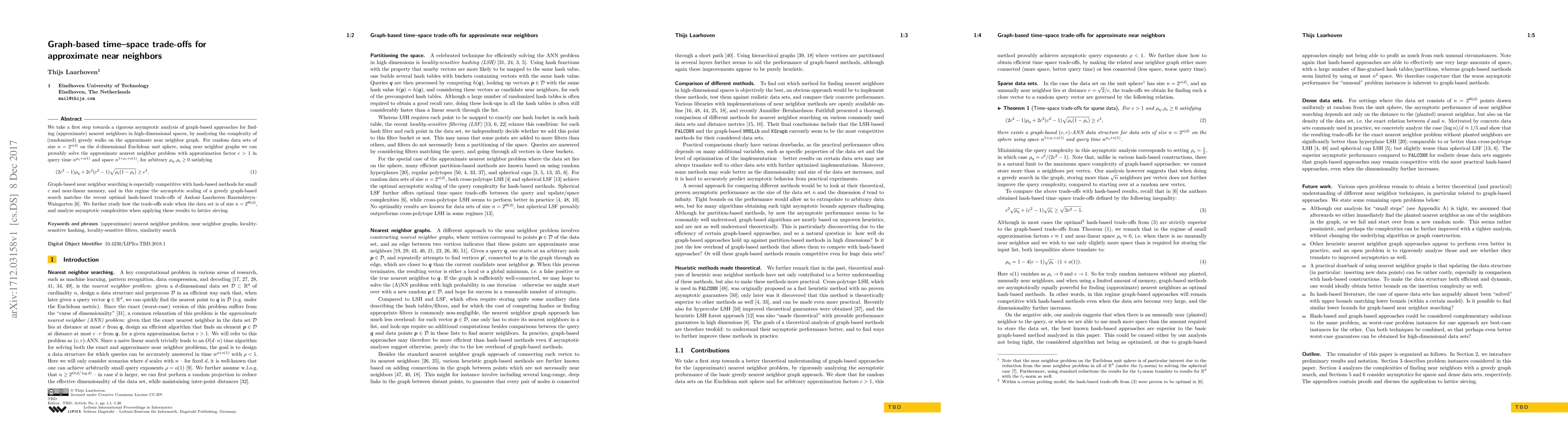 This paper rigorously analyzes graph-based methods for finding approximate nearest neighbors in high-dimensional spaces, demonstrating time-space trade-offs for randomized greedy walks on near neighbor graphs. It shows that for small data sets, these methods compete effectively with hash-based approaches, achieving optimal trade-offs for small approximation factors and near-linear memory.