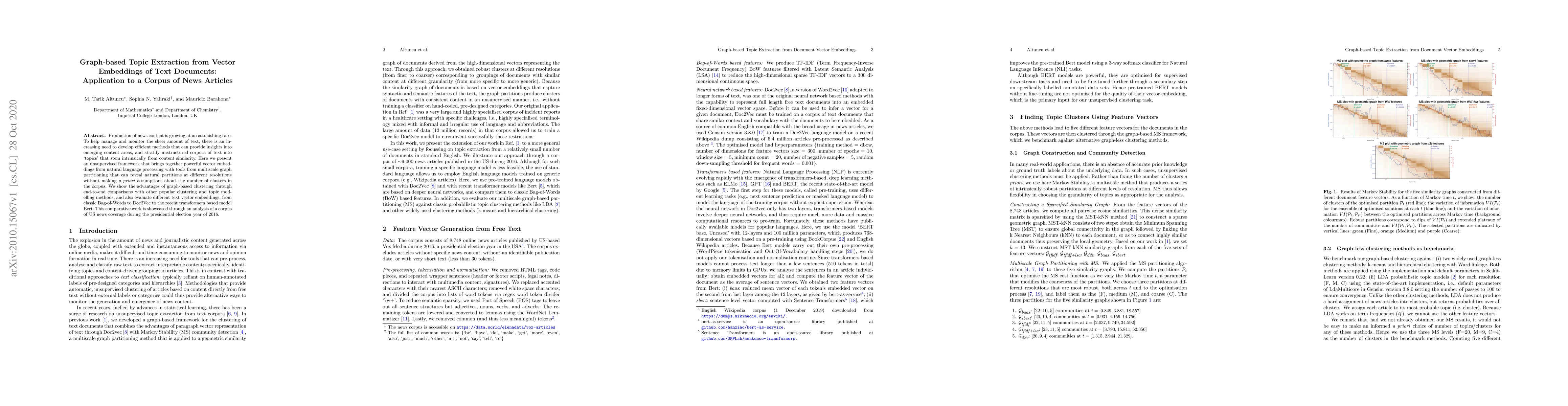 This paper proposes an unsupervised framework for extracting topics from news articles using vector embeddings and graph partitioning, outperforming traditional clustering methods on a 2016 US presidential election corpus.