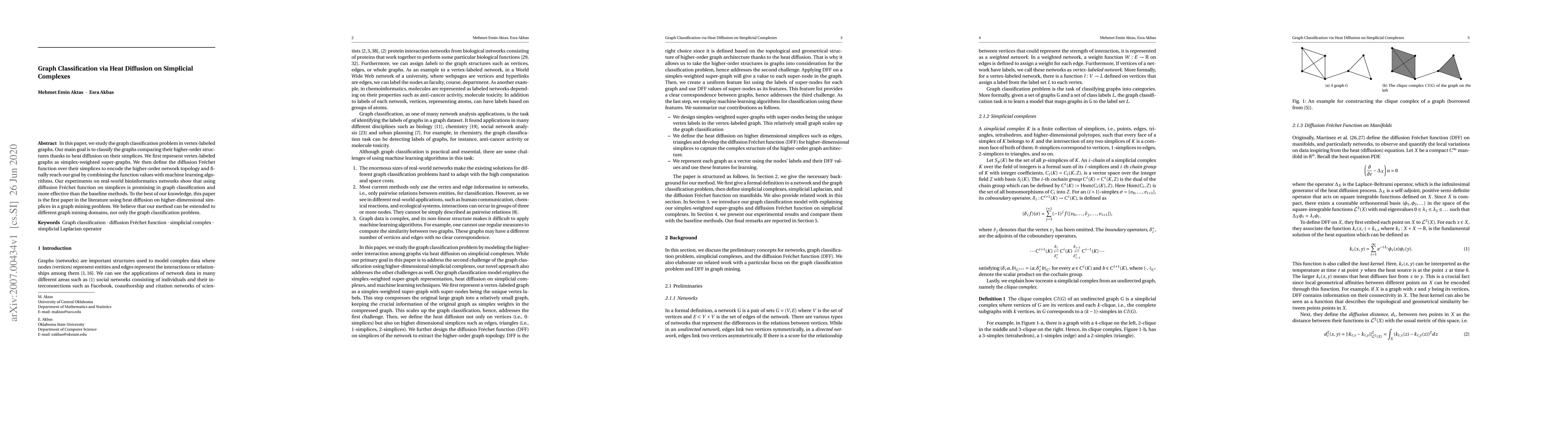 This paper proposes a novel method for graph classification using heat diffusion on simplices to capture higher-order structures in vertex-labeled graphs. The diffusion Fréchet function is employed to encode these structures, which, when combined with machine learning, outperforms baseline methods, as demonstrated on bioinformatics networks.